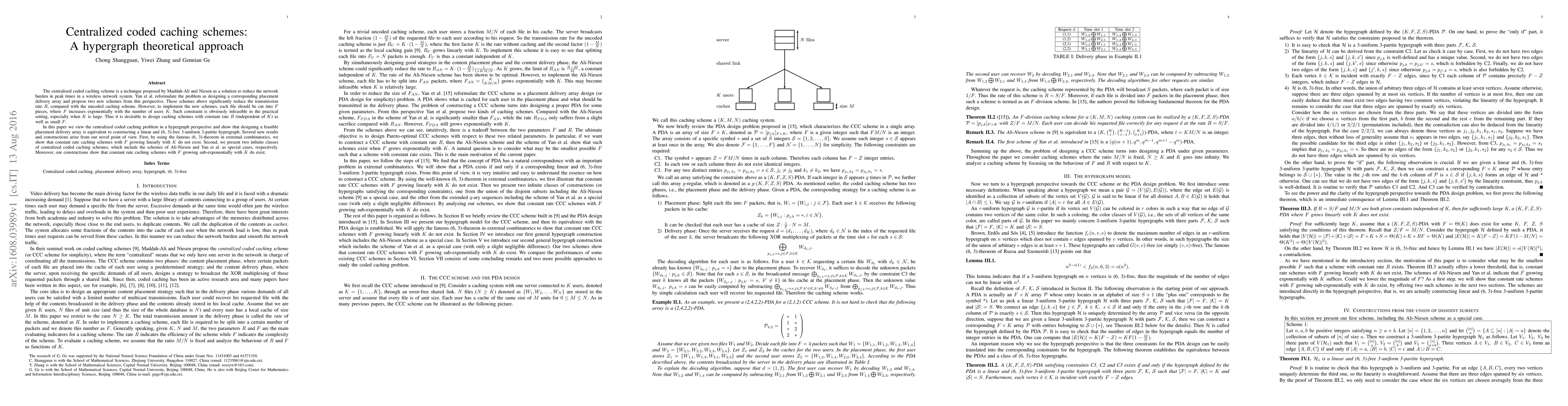 The centralized coded caching scheme is a technique proposed by Maddah-Ali and Niesen as a solution to reduce the network burden in peak times in a wireless system. Later Yan et al. reformulated the problem as designing a corresponding placement delivery array, and proposed two new schemes from this perspective. These schemes above significantly reduce the transmission rate $R$, compared with the uncoded caching scheme. However, to implement the new schemes, each file should be cut into $F$ pieces, where $F$ increases exponentially with the number of users $K$. Such constraint is obviously infeasible in the practical setting, especially when $K$ is large. Thus it is desirable to design caching schemes with constant rate $R$ (independent of $K$) as well as small $F$. In this paper we view the centralized coded caching problem in a hypergraph perspective and show that designing a feasible placement delivery array is equivalent to constructing a linear and (6, 3)-free 3-uniform 3-partite hypergraph. Several new results and constructions arise from our novel point of view. First, by using the famous (6, 3)-theorem in extremal combinatorics, we show that constant rate caching schemes with $F$ growing linearly with $K$ do not exist. Second, we present two infinite classes of centralized coded caching schemes, which include the schemes of Ali-Niesen and Yan et al. as special cases, respectively. Moreover, our constructions show that constant rate caching schemes with $F$ growing sub-exponentially with $K$ do exist.