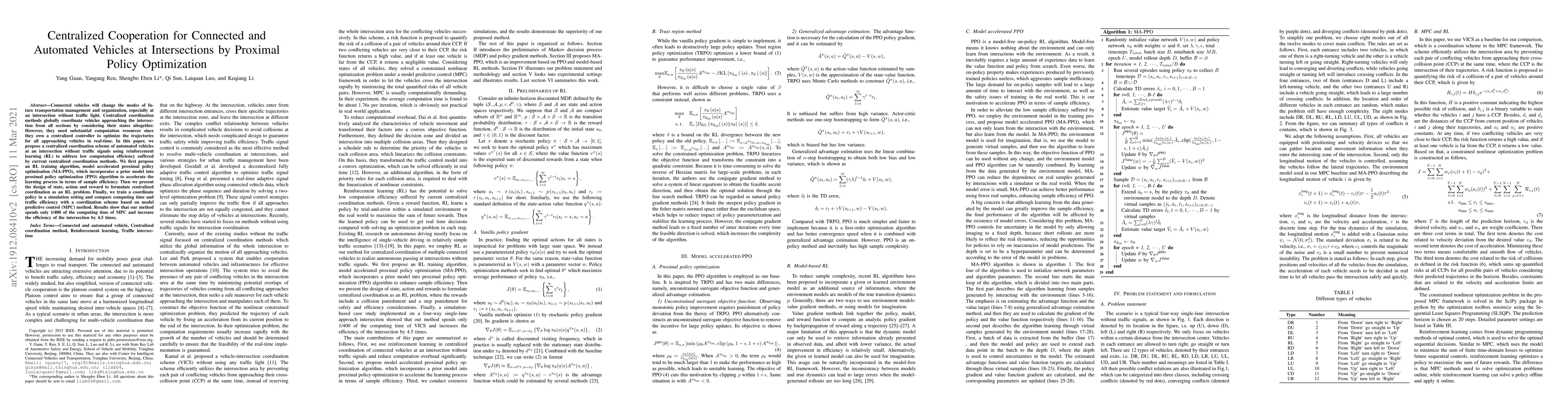 This paper proposes a reinforcement learning approach using model accelerated proximal policy optimization (MA-PPO) to enhance centralized coordination for connected and automated vehicles at intersections without traffic lights. The method significantly reduces computation time and improves traffic efficiency compared to model predictive control.