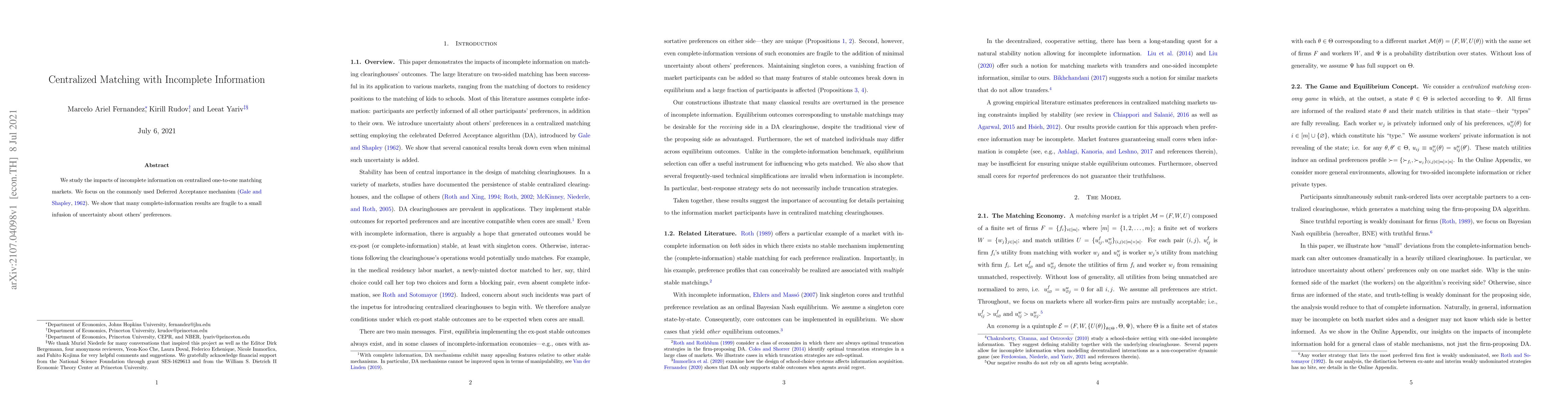 This paper investigates how incomplete information affects centralized one-to-one matching markets using the Deferred Acceptance mechanism. It demonstrates that results from complete-information settings can be significantly disrupted by even minor uncertainties regarding others' preferences.