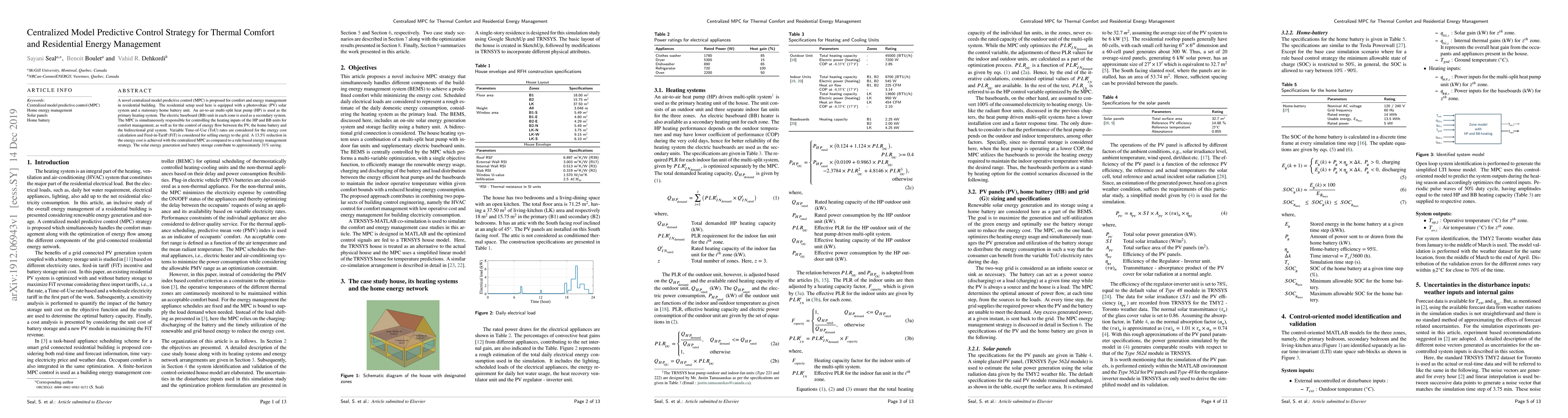 This paper proposes a centralized model predictive control strategy for managing thermal comfort and energy in residential buildings, integrating a PV system, home battery, and heat pump. The MPC optimizes heating controls and energy flow, achieving a 13.5% reduction in energy costs compared to rule-based strategies, with solar and battery storage contributing to a 31% savings.