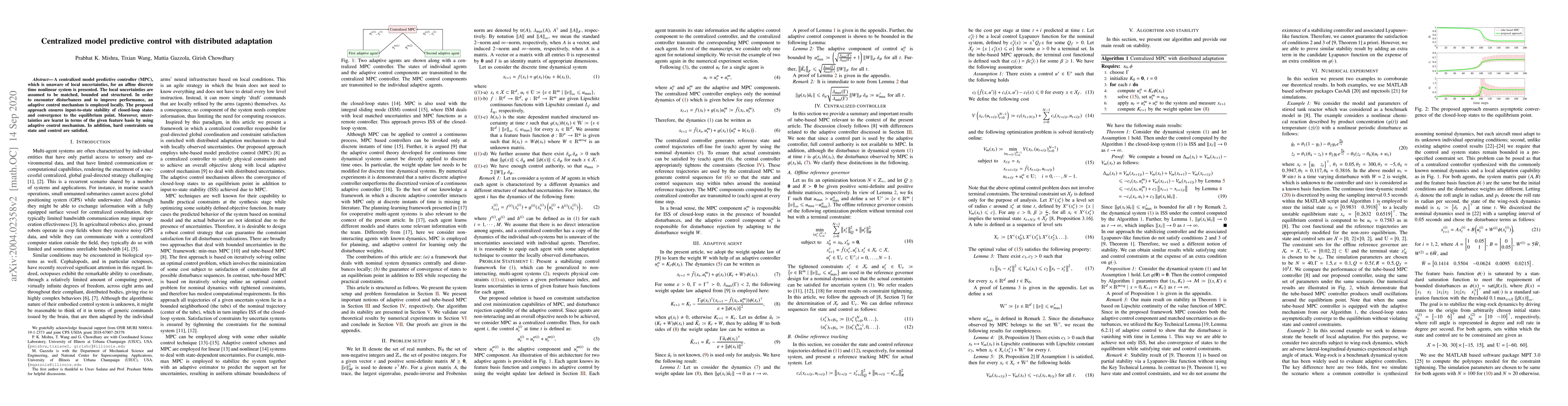 A centralized model predictive controller (MPC), which is unaware of local uncertainties, for an affine discrete time nonlinear system is presented. The local uncertainties are assumed to be matched, bounded and structured. In order to encounter disturbances and to improve performance, an adaptive control mechanism is employed locally. The proposed approach ensures input-to-state stability of closed-loop states and convergence to the equilibrium point. Moreover, uncertainties are learnt in terms of the given feature basis by using adaptive control mechanism. In addition, hard constraints on state and control are satisfied.