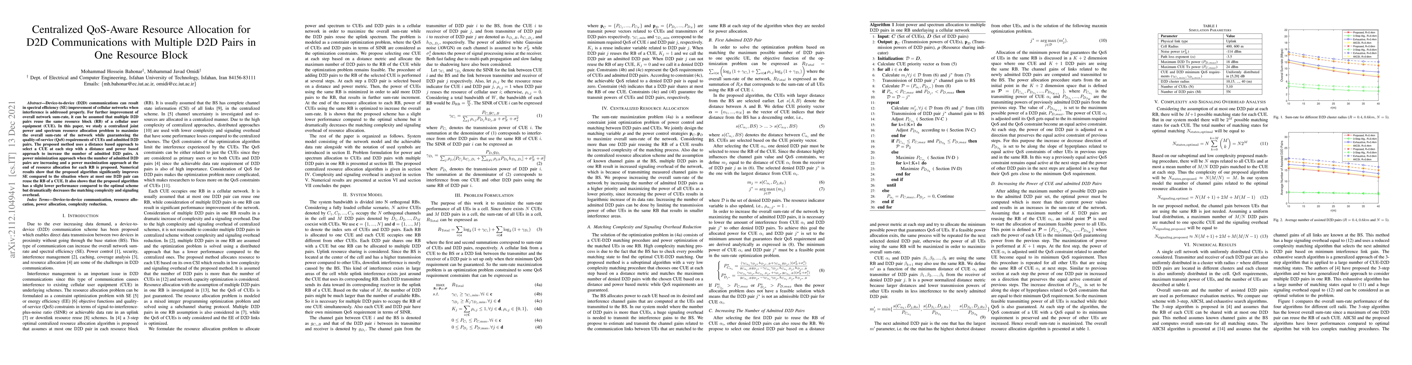 This paper proposes a centralized QoS-aware resource allocation method for D2D communications, optimizing joint power and spectrum allocation to maximize network sum-rate while ensuring QoS for both cellular users and D2D pairs. The algorithm uses a distance-based approach to select CUE and a power-based approach to manage D2D pairs, achieving significant improvements in spectral efficiency compared to single D2D pair reuse.