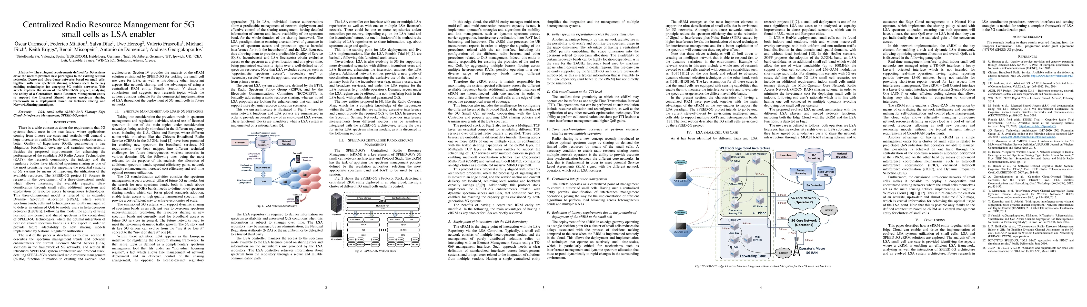 The paper discusses the SPEED-5G project's vision, highlighting how a Centralized Radio Resource Management (CRRM) entity can facilitate Licensed Shared Access (LSA) in 5G small cell networks using Network Slicing and Sharing paradigms. It emphasizes the potential of CRRM in meeting 5G's stringent requirements through dense small cell deployments and new spectrum sharing schemes.