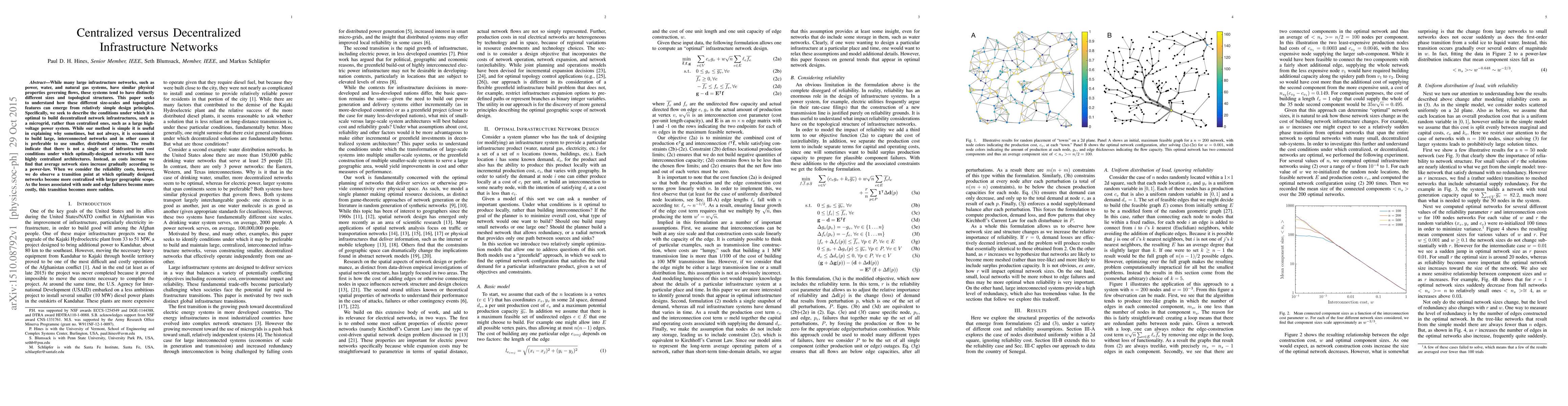 This research identifies that the optimal design of infrastructure networks (like power or water systems) shifts from centralized to decentralized as costs increase, following a power-law. A transition to more centralized networks occurs with higher reliability costs, marked by a sudden increase in geographic scope.