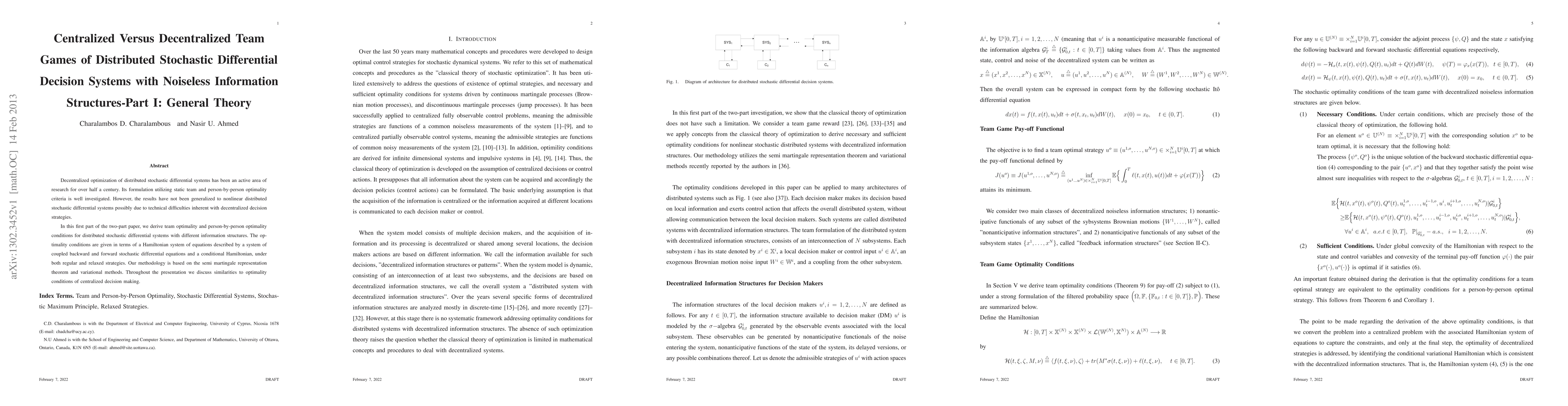 This paper develops general theory for decentralized optimization of nonlinear distributed stochastic differential systems, deriving team and person-by-person optimality conditions using Hamiltonian systems and semi-martingale representation. It compares these conditions to those of centralized decision making.