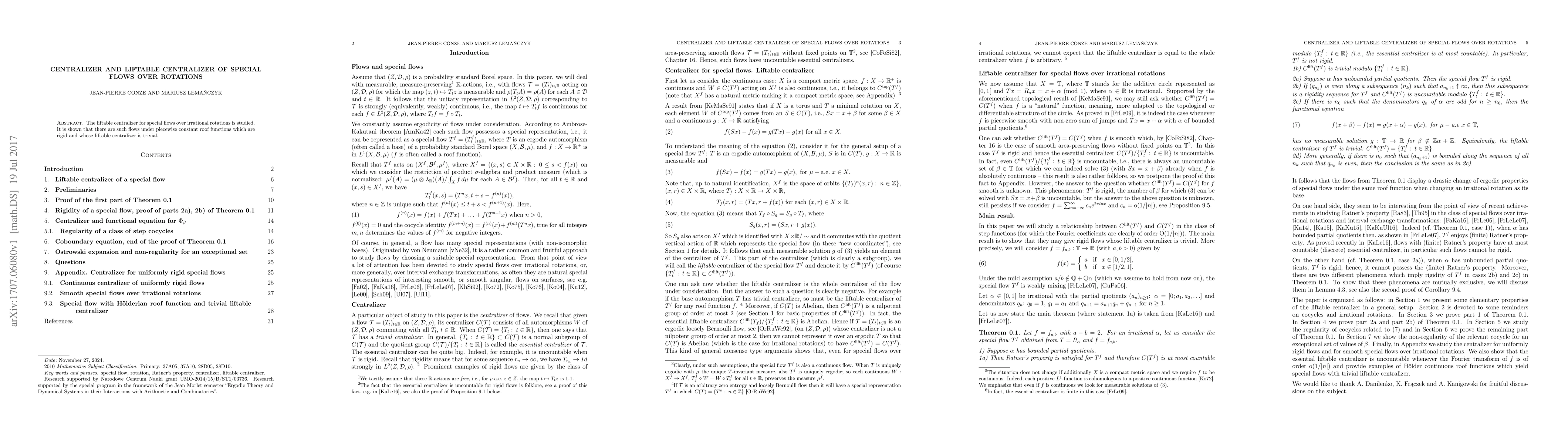 Summary: This paper investigates liftable centralizers for special flows over irrational rotations, demonstrating the existence of rigid flows under piecewise constant roof functions with trivial liftable centralizers.