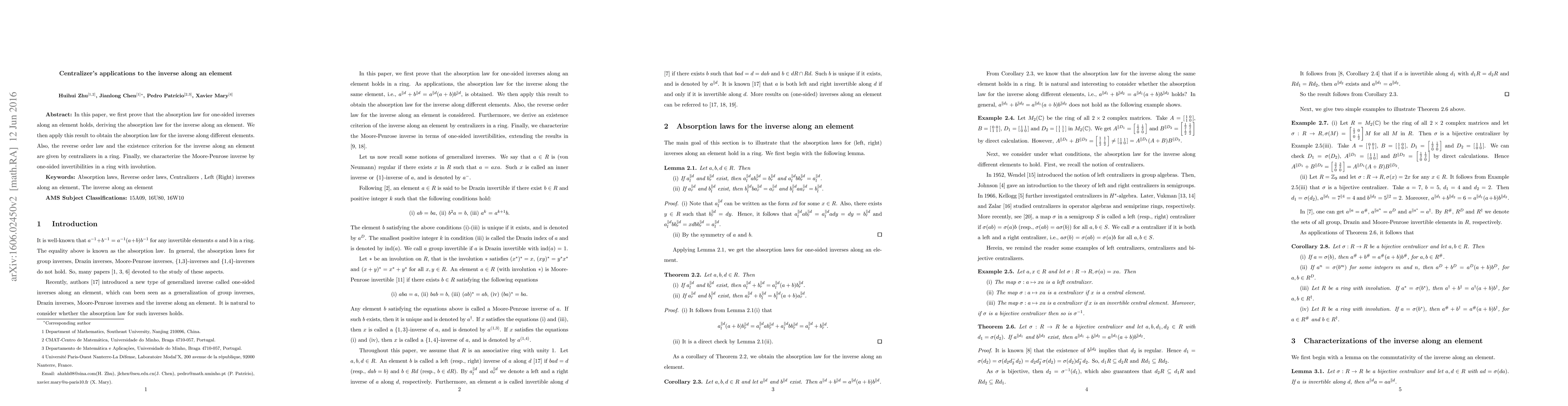 This paper proves the absorption law for inverses along an element and extends it to different elements using centralizers in a ring. It also establishes the reverse order law and the existence criterion for such inverses, and characterizes the Moore-Penrose inverse via one-sided invertibilities in a ring with involution.