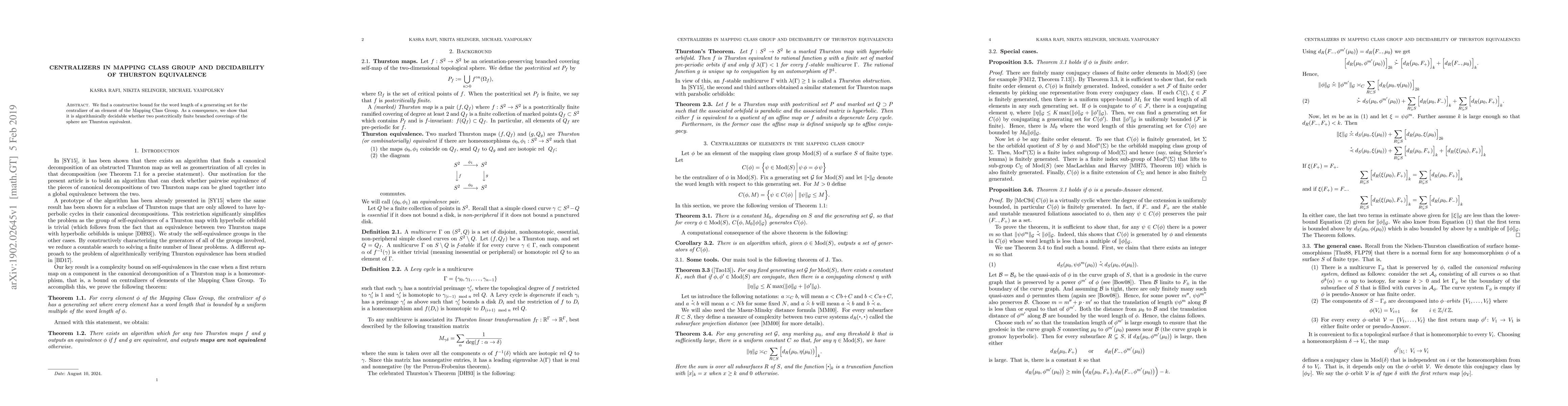 Summary: This paper provides a constructive bound for the word length of centralizers in the Mapping Class Group, leading to the algorithmic decidability of Thurston equivalence for postcritically finite branched coverings of the sphere.