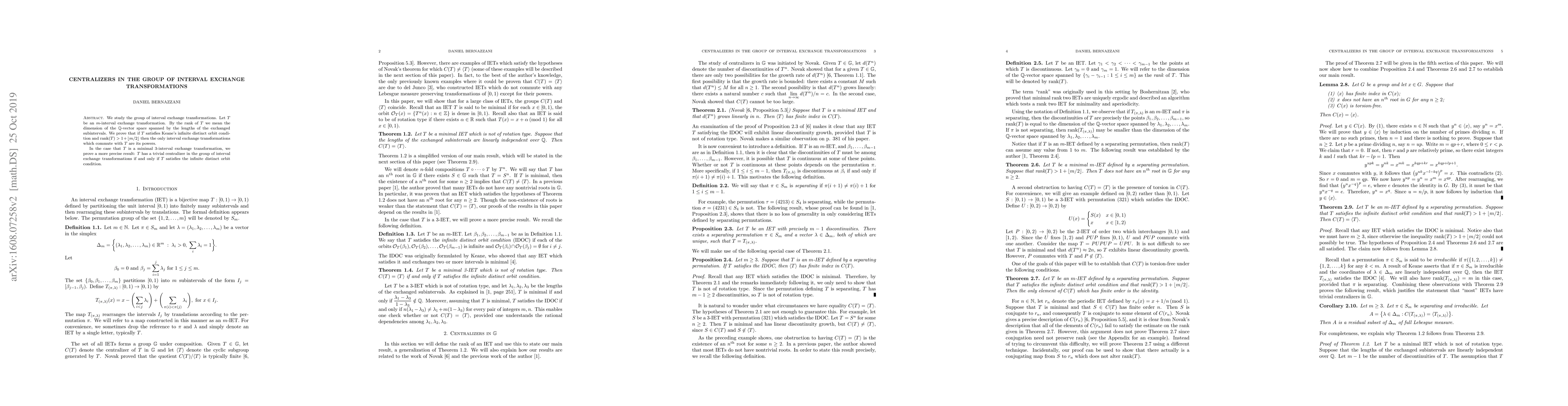 This research examines interval exchange transformations, proving that transformations with high rank and satisfying Keane's condition have trivial centralizers, except for their own powers. For minimal 3-interval exchange transformations, it further shows that the centralizer is trivial if and only if the transformation meets the infinite distinct orbit condition.