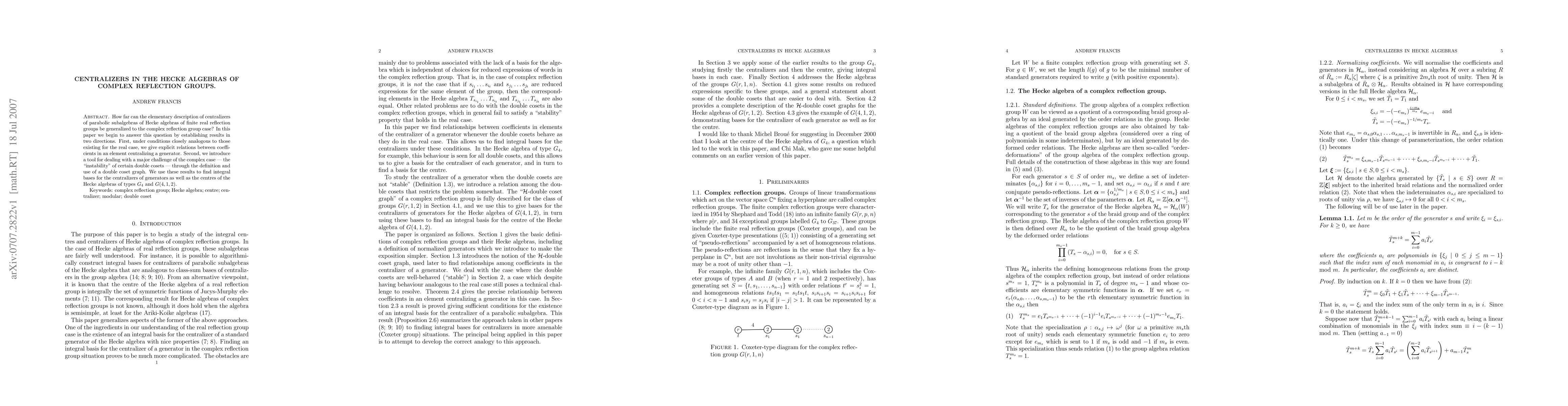 This paper investigates the centralizers in the Hecke algebras of complex reflection groups, establishing explicit relations and introducing a double coset graph tool to handle complex case challenges. It finds integral bases for centralizers and centres in Hecke algebras of types $G_4$ and $G(4,1,2)$.