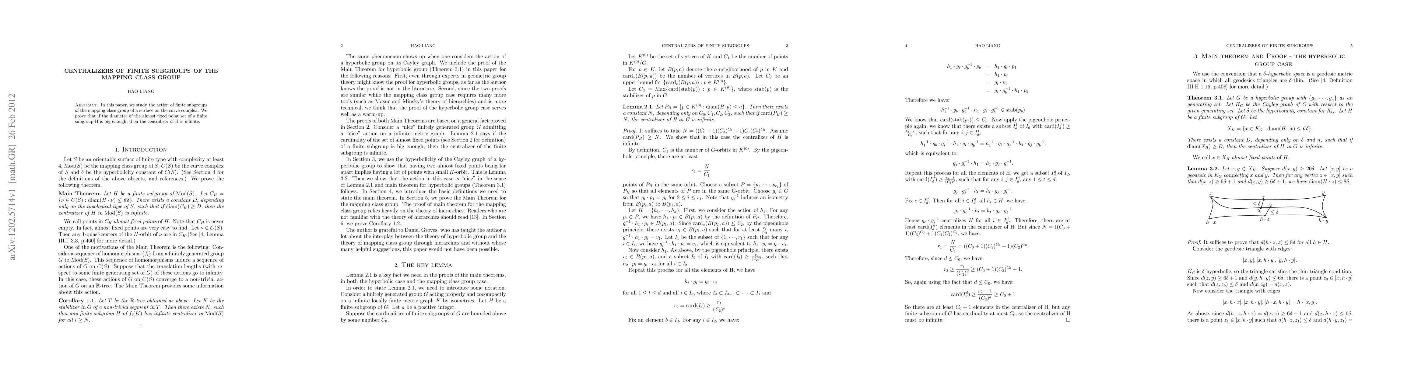 Summary: This research investigates the action of finite subgroups within the mapping class group of a surface on the curve complex, proving that sufficiently large diameters in the almost fixed point set of these subgroups result in infinite centralizers.
