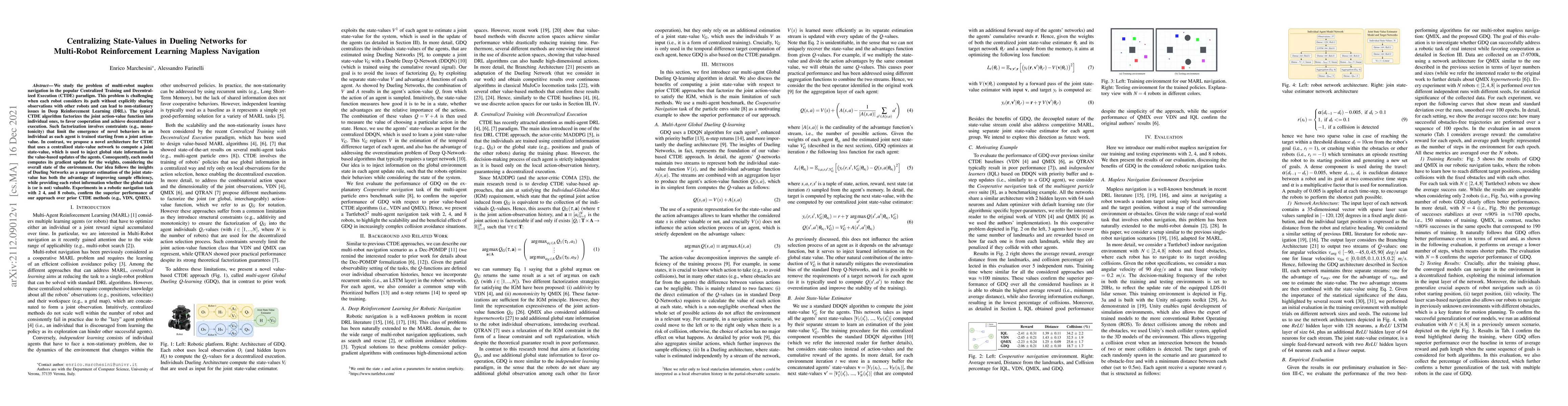 We study the problem of multi-robot mapless navigation in the popular Centralized Training and Decentralized Execution (CTDE) paradigm. This problem is challenging when each robot considers its path without explicitly sharing observations with other robots and can lead to non-stationary issues in Deep Reinforcement Learning (DRL). The typical CTDE algorithm factorizes the joint action-value function into individual ones, to favor cooperation and achieve decentralized execution. Such factorization involves constraints (e.g., monotonicity) that limit the emergence of novel behaviors in an individual as each agent is trained starting from a joint action-value. In contrast, we propose a novel architecture for CTDE that uses a centralized state-value network to compute a joint state-value, which is used to inject global state information in the value-based updates of the agents. Consequently, each model computes its gradient update for the weights, considering the overall state of the environment. Our idea follows the insights of Dueling Networks as a separate estimation of the joint state-value has both the advantage of improving sample efficiency, while providing each robot information whether the global state is (or is not) valuable. Experiments in a robotic navigation task with 2 4, and 8 robots, confirm the superior performance of our approach over prior CTDE methods (e.g., VDN, QMIX).