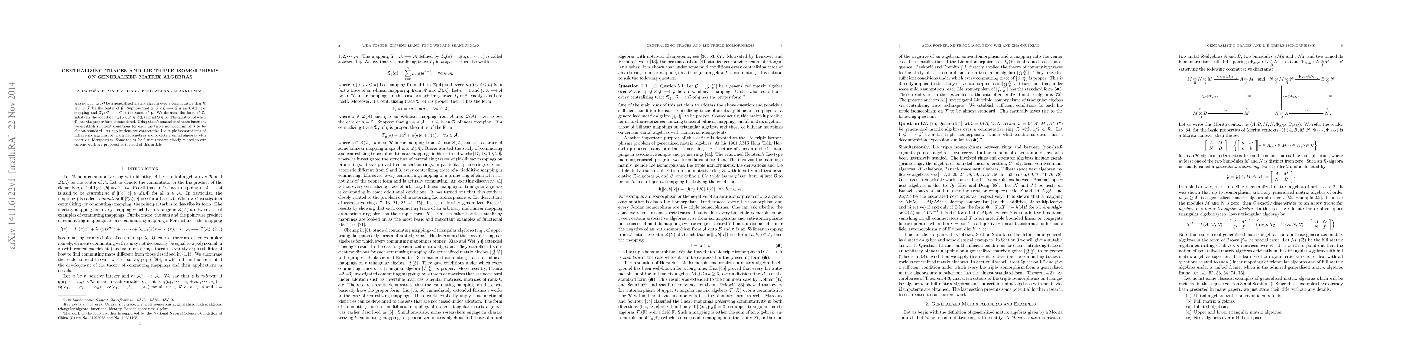 This paper investigates the trace function ${\mathfrak T}_{\mathfrak q}$ on generalized matrix algebras $\mathcal{G}$ over a commutative ring $\mathcal{R}$, establishing conditions under which it centralizes the algebra. It also explores Lie triple isomorphisms and their characterizations for various matrix algebras.