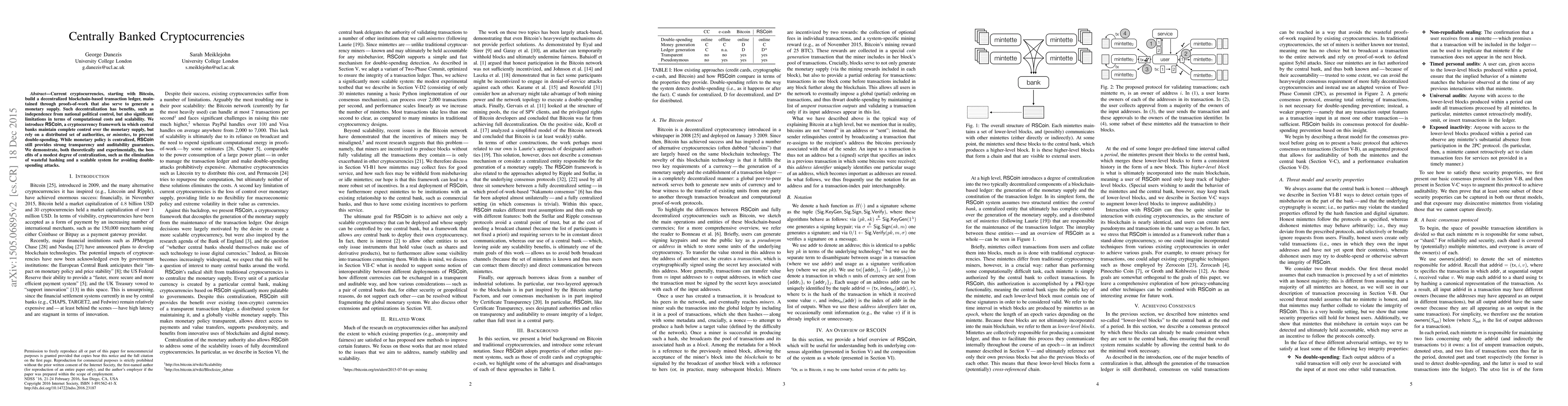 RSCoin introduces a cryptocurrency framework where central banks control the monetary supply but use distributed authorities to prevent double-spending, offering benefits like scalability and transparency guarantees.