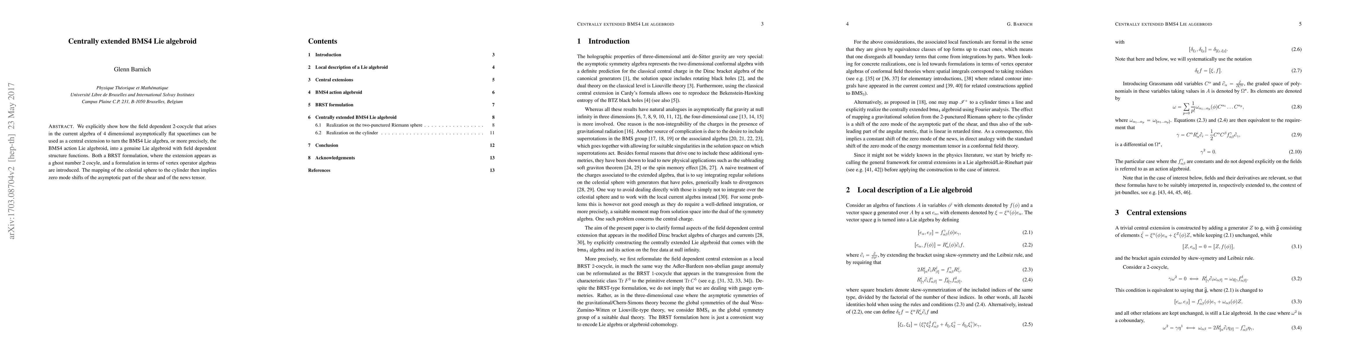 We explicitly show how the field dependent 2-cocycle that arises in the current algebra of 4 dimensional asymptotically flat spacetimes can be used as a central extension to turn the BMS4 Lie algebra, or more precisely, the BMS4 action Lie algebroid, into a genuine Lie algebroid with field dependent structure functions. Both a BRST formulation, where the extension appears as a ghost number 2 cocyle, and a formulation in terms of vertex operator algebras are introduced. The mapping of the celestial sphere to the cylinder then implies zero mode shifts of the asymptotic part of the shear and of the news tensor.