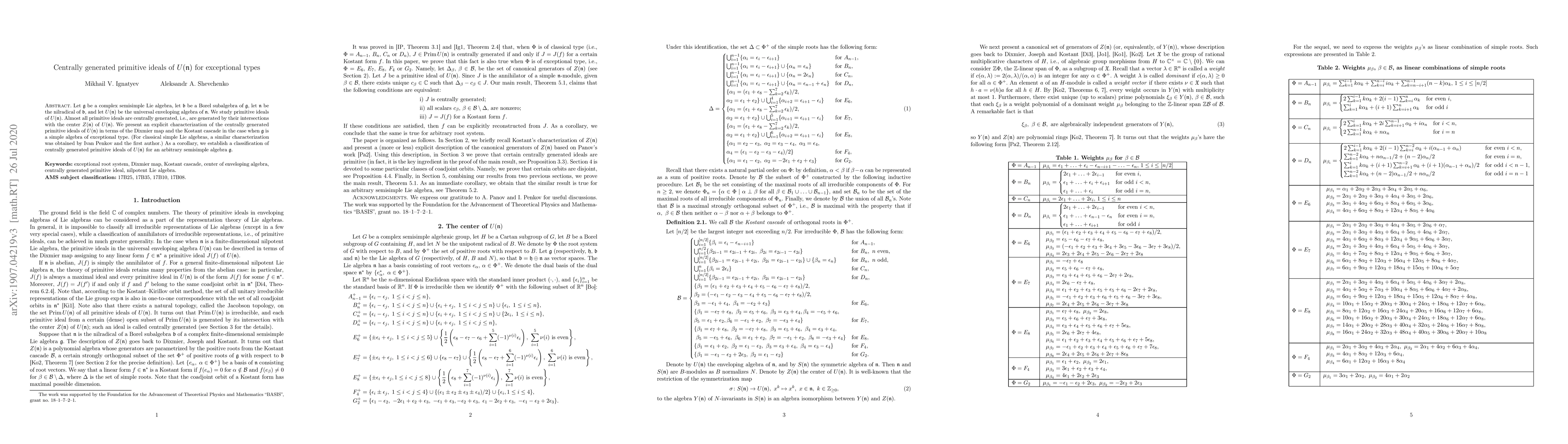 Let $\mathfrak{g}$ be a complex semisimple Lie algebra, $\mathfrak{b}$ be a Borel subalgebra of $\mathfrak{g}$, $\mathfrak{n}$ be the nilradical of $\mathfrak{b}$, and $U(\mathfrak{n})$ be the universal enveloping algebra of $\mathfrak{n}$. We study primitive ideals of $U(\mathfrak{n})$. Almost all primitive ideals are centrally generated, i.e., are generated by their intersections with the center $Z(\mathfrak{n})$ of $U(\mathfrak{n})$. We present an explicit characterization of the centrally generated primitive ideals of $U(\mathfrak{n})$ in terms of the Dixmier map and the Kostant cascade in the case when $\mathfrak{g}$ is a simple algebra of exceptional type. (For classical simple Lie algebras, a similar characterization was obtained by Ivan Penkov and the first author.) As a corollary, we establish a classification of centrally generated primitive ideals of $U(\mathfrak{n})$ for an arbitrary semisimple algebra $\mathfrak{g}$.