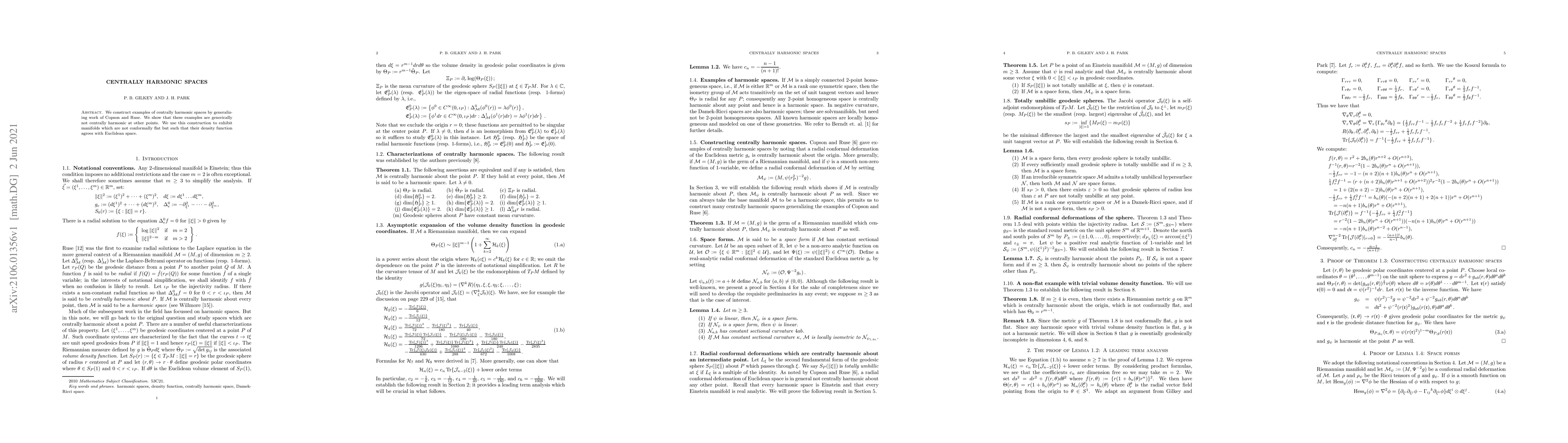 We construct examples of centrally harmonic spaces by generalizing work of Copson and Ruse. We show that these examples are generically not centrally harmonic at other points. We use this construction to exhibit manifolds which are not conformally flat but such that their density function agrees with Euclidean space.