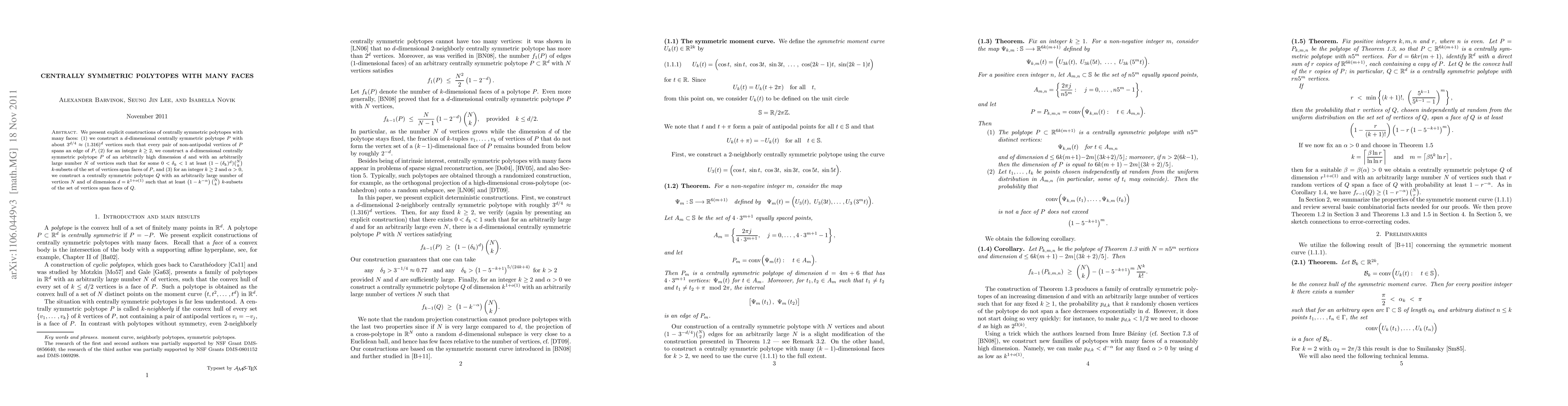 This paper constructs centrally symmetric polytopes with numerous faces, presenting constructions for polytopes with specific vertex properties and subsets that span faces, including high-dimensional examples with many vertices and varying dimensions.