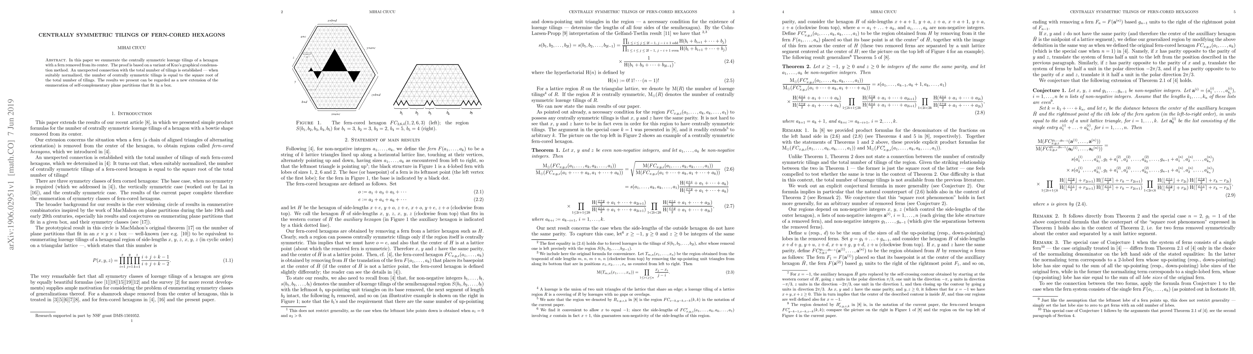 This paper enumerates centrally symmetric lozenge tilings of a hexagonal shape with a fern-shaped center removed, using a modified Kuo's graphical condensation method. An unexpected finding is that the number of such tilings, when normalized, equals the square root of the total number of tilings.