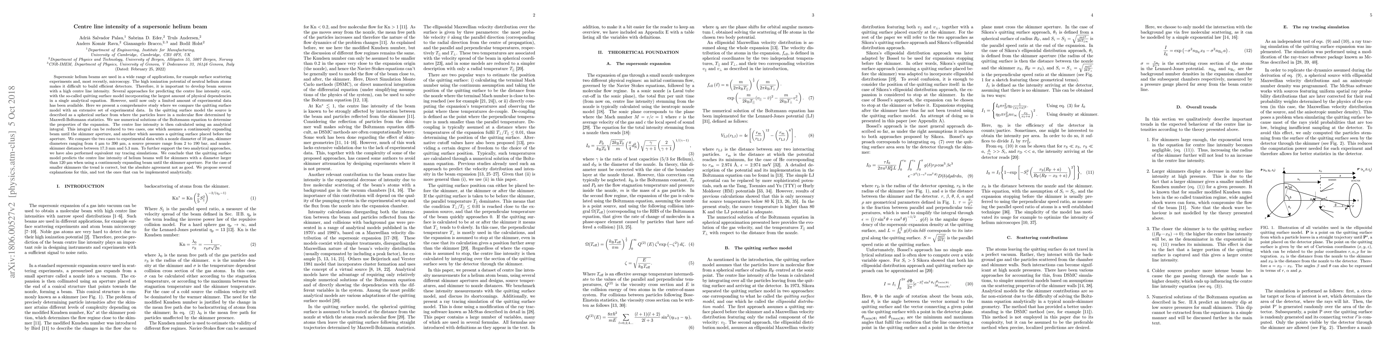 Supersonic helium beams are used in a wide range of applications, for example surface scattering experiments and, most recently, microscopy. The high ionization potential of neutral helium atoms makes it difficult to build efficient detectors. Therefore, it is important to develop beam sources with a high centre line intensity. Several approaches for predicting the centre line intensity exist, with the quitting surface model incorporating the largest amount of physical dependencies. However, until now only a limited amount of experimental data has been available. Here we present a study where we compare the quitting surface model with an extensive set of experimental data. In the quitting surface model the source is described as a sphere from where the particles leave in a molecular flow determined by Maxwell-Boltzmann statistics. We use numerical solutions of the Boltzmann equation to determine its properties. The centre-line intensity is then calculated using an analytical integral. This integral can be reduced to two cases, one which assumes a continuously expanding beam until the skimmer aperture, and another which assumes a quitting surface placed before the aperture. We compare the two cases to experimental data with a nozzle diameter of 10 micron, skimmer diameters ranging from 4 micron to 390 micron, a source pressure range from 2 to 190 bar, and nozzle-skimmer distances between 17.3 mm and 5.3 mm. To support the two analytical approaches, we have also performed equivalent ray tracing simulations. We conclude that the quitting surface model predicts the centre line intensity well for skimmers with a diameter larger than 120 micron when using a beam expanding until the skimmer aperture. For the case of smaller skimmers the trend is correct, but the absolute agreement not as good. We propose several explanations for this, and test the ones that can be implemented analytically.