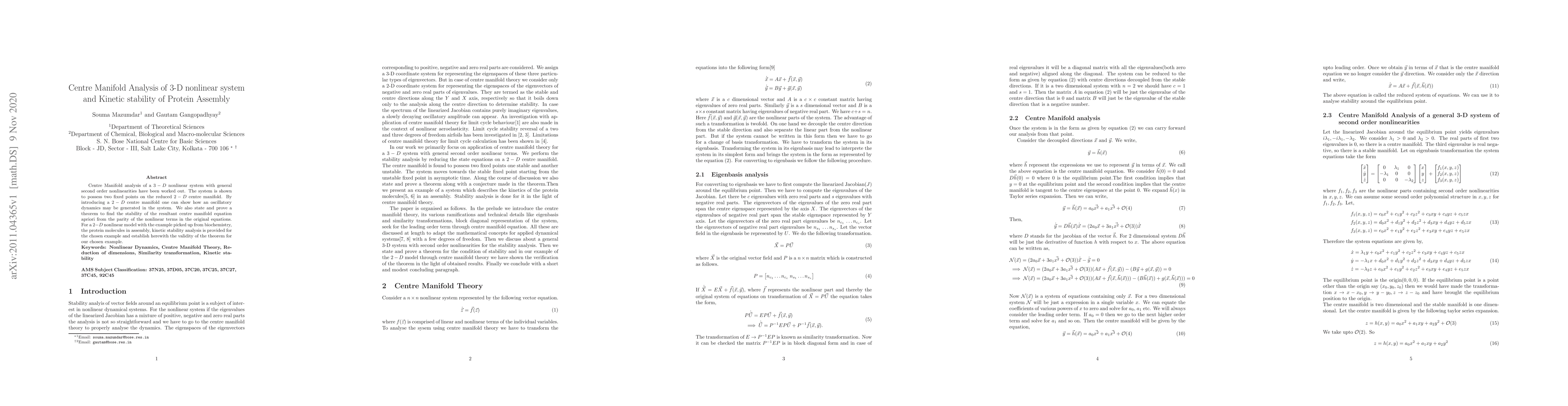 This paper uses Centre Manifold analysis to study a 3D nonlinear system in protein assembly, showing how oscillatory dynamics can emerge from a reduced 2D center manifold.