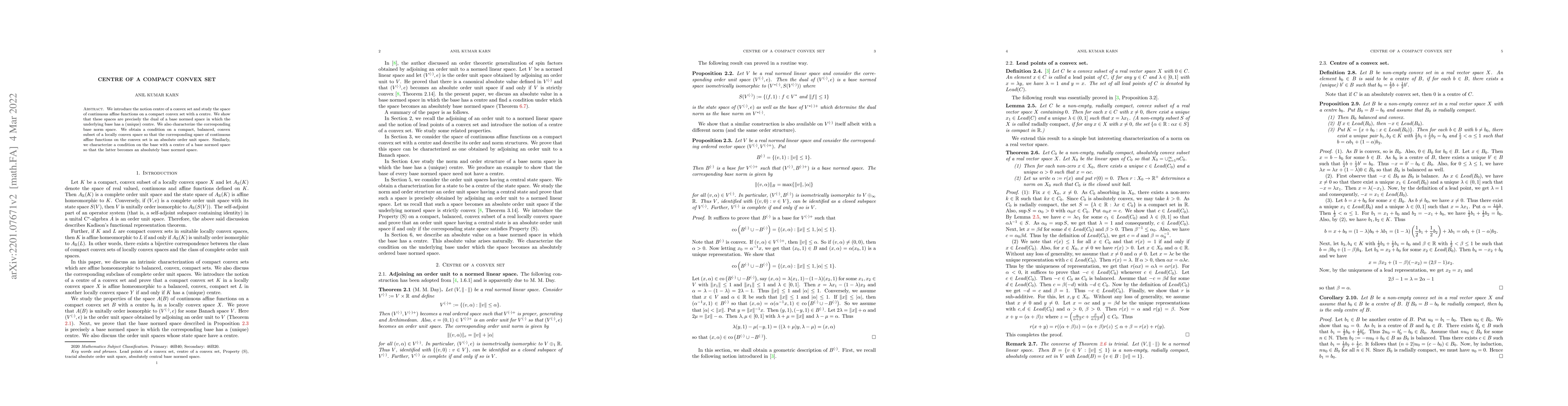 We introduce the notion centre of a convex set and study the space of continuous affine functions on a compact convex set with a centre. We show that these spaces are precisely the dual of a base normed space in which the underlying base has a (unique) centre. We also characterize the corresponding base norm space. We obtain a condition on a compact, balanced, convex subset of a locally convex space so that the corresponding space of continuous affine functions on the convex set is an absolute order unit space. Similarly, we characterize a condition on the base with a centre of a base normed space so that the latter becomes an absolutely base normed space.