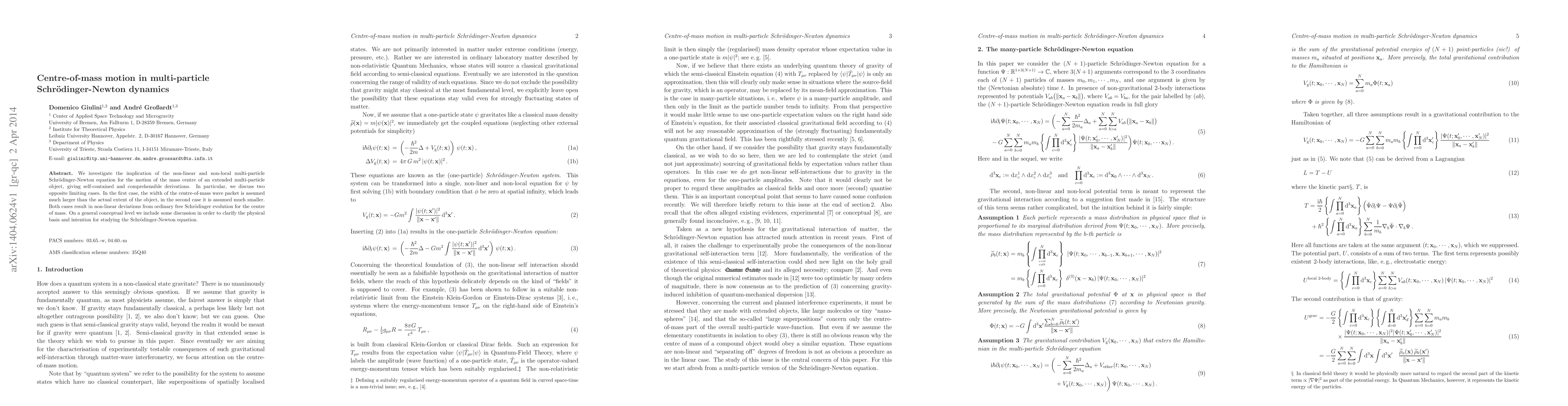 We investigate the implication of the non-linear and non-local multi-particle Schroedinger-Newton equation for the motion of the mass centre of an extended multi-particle object, giving self-contained and comprehensible derivations. In particular, we discuss two opposite limiting cases. In the first case, the width of the centre-of-mass wave packet is assumed much larger than the actual extent of the object, in the second case it is assumed much smaller. Both cases result in non-linear deviations from ordinary free Schroedinger evolution for the centre of mass. On a general conceptual level we include some discussion in order to clarify the physical basis and intention for studying the Schroedinger-Newton equation.