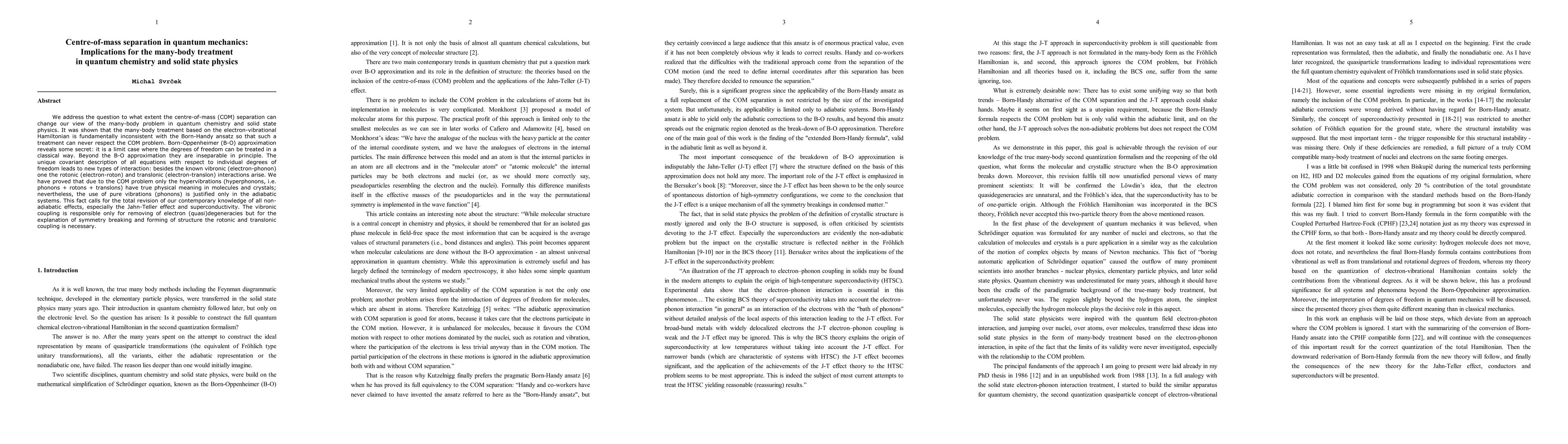 We address the question to what extent the centre-of-mass (COM) separation can change our view of the many-body problem in quantum chemistry and solid state physics. It was shown that the many-body treatment based on the electron-vibrational Hamiltonian is fundamentally inconsistent with the Born-Handy ansatz so that such a treatment can never respect the COM problem. Born-Oppenheimer (B-O) approximation reveals some secret: it is a limit case where the degrees of freedom can be treated in a classical way. Beyond the B-O approximation they are inseparable in principle. The unique covariant description of all equations with respect to individual degrees of freedom leads to new types of interaction: besides the known vibronic (electron-phonon) one the rotonic (electron-roton) and translonic (electron-translon) interactions arise. We have proved that due to the COM problem only the hypervibrations (hyperphonons, i.e. phonons + rotons + translons) have true physical meaning in molecules and crystals; nevertheless, the use of pure vibrations (phonons) is justified only in the adiabatic systems. This fact calls for the total revision of our contemporary knowledge of all non-adiabatic effects, especially the Jahn-Teller effect and superconductivity. The vibronic coupling is responsible only for removing of electron (quasi)degeneracies but for the explanation of symmetry breaking and forming of structure the rotonic and translonic coupling is necessary.