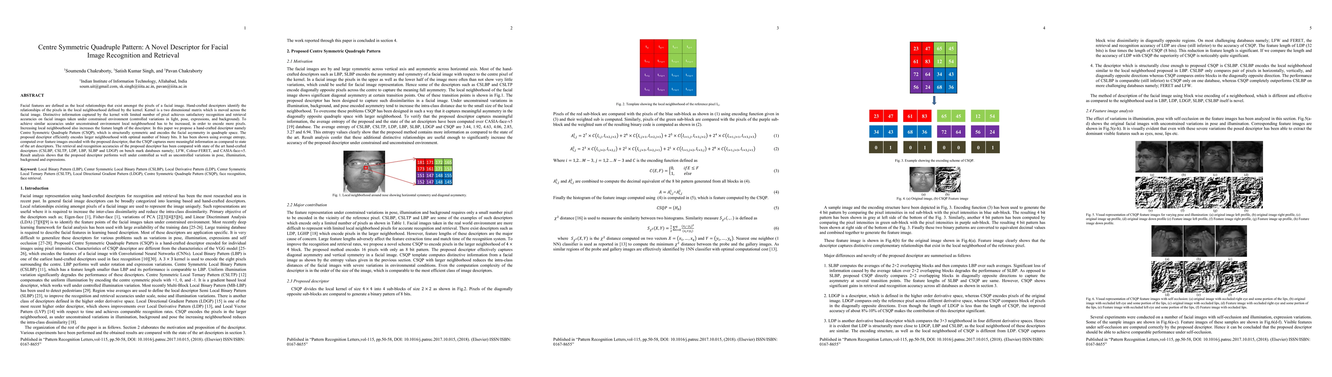 This paper introduces the Centre Symmetric Quadruple Pattern (CSQP) descriptor for facial image recognition and retrieval, which efficiently encodes larger local neighborhoods with minimal binary bits. The proposed descriptor, shown to capture more meaningful information than existing methods, achieves high recognition and retrieval accuracies under both constrained and unconstrained environments.