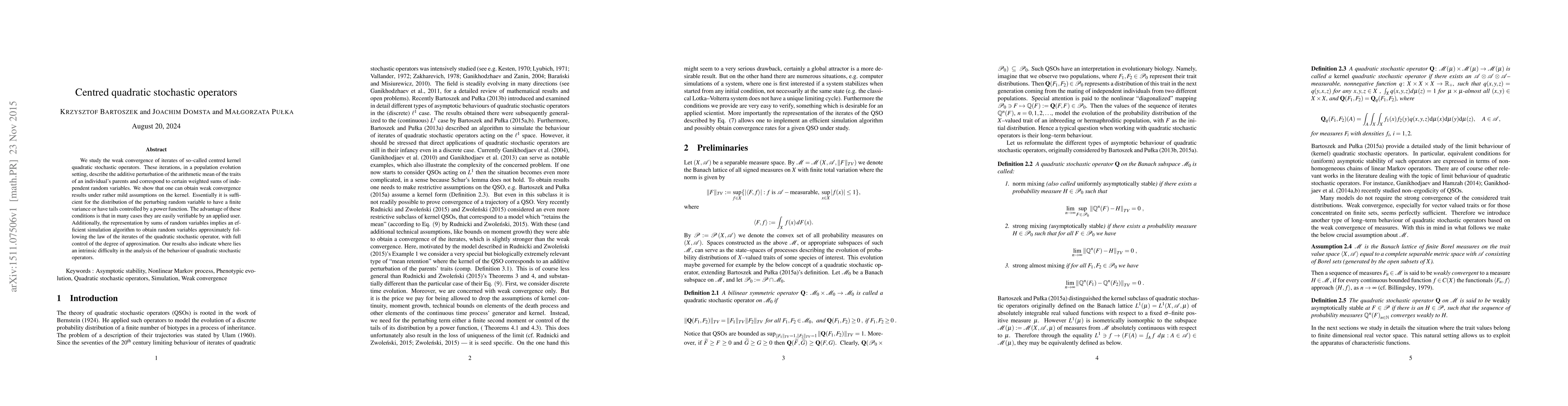 We study the weak convergence of iterates of so-called centred kernel quadratic stochastic operators. These iterations, in a population evolution setting, describe the additive perturbation of the arithmetic mean of the traits of an individual's parents and correspond to certain weighted sums of independent random variables. We show that one can obtain weak convergence results under rather mild assumptions on the kernel. Essentially it is sufficient for the distribution of the perturbing random variable to have a finite variance or have tails controlled by a power function. The advantage of these conditions is that in many cases they are easily verifiable by an applied user. Additionally, the representation by sums of random variables implies an efficient simulation algorithm to obtain random variables approximately following the law of the iterates of the quadratic stochastic operator, with full control of the degree of approximation. Our results also indicate where lies an intrinsic difficulty in the analysis of the behaviour of quadratic stochastic operators.