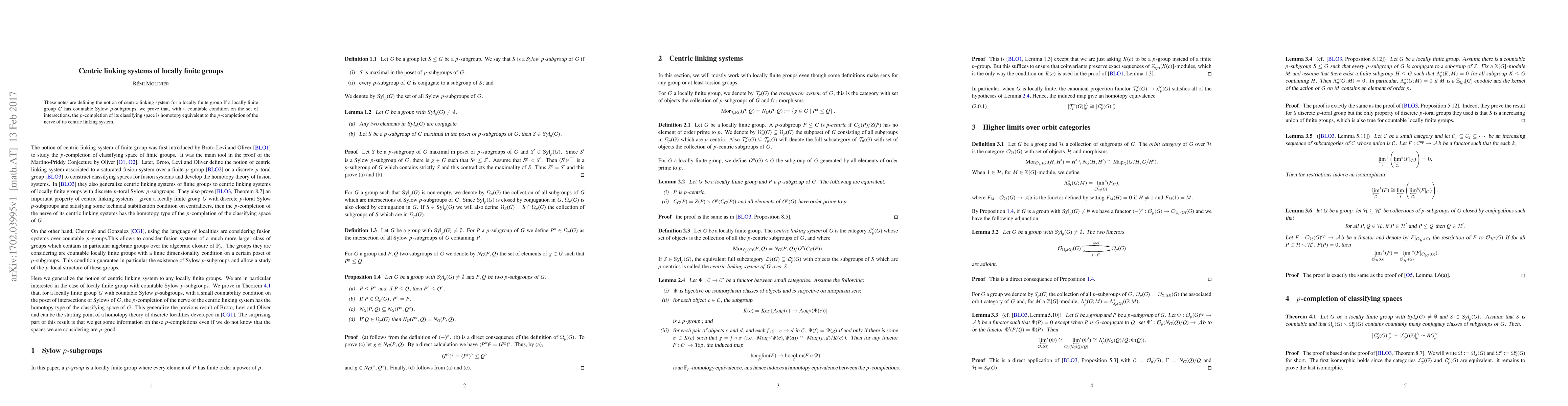 These notes are defining the notion of centric linking system for a locally finite group If a locally finite group $G$ has countable Sylow $p$-subgroups, we prove that, with a countable condition on the set of intersections, the $p$-completion of its classifying space is homotopy equivalent to the $p$-completion of the nerve of its centric linking system.