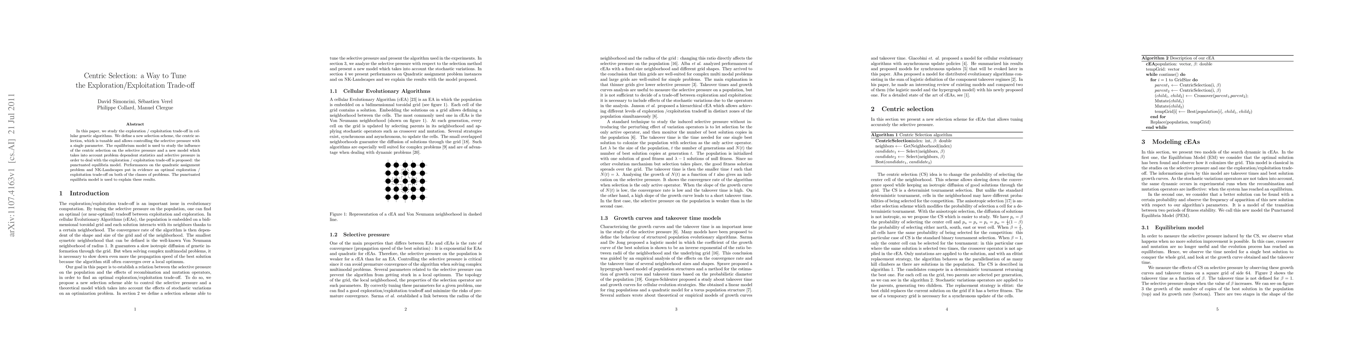 This paper introduces centric selection, a tunable selection scheme in cellular genetic algorithms that controls selective pressure via a single parameter, and proposes the punctuated equilibria model to manage the exploration/exploitation trade-off. Experiments on quadratic assignment problems and NK-Landscapes demonstrate the method's effectiveness in achieving optimal balance.