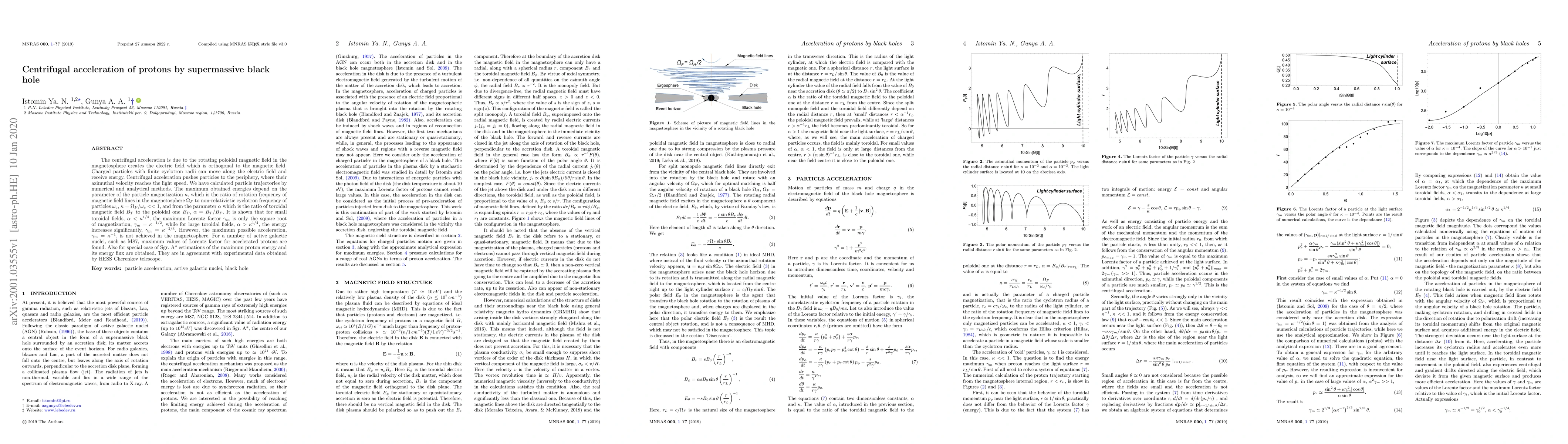 Protons accelerated by a supermassive black hole can reach energies up to 1,000 times their initial energy due to centrifugal acceleration, with the maximum energy dependent on the strength of magnetic fields in the magnetosphere.