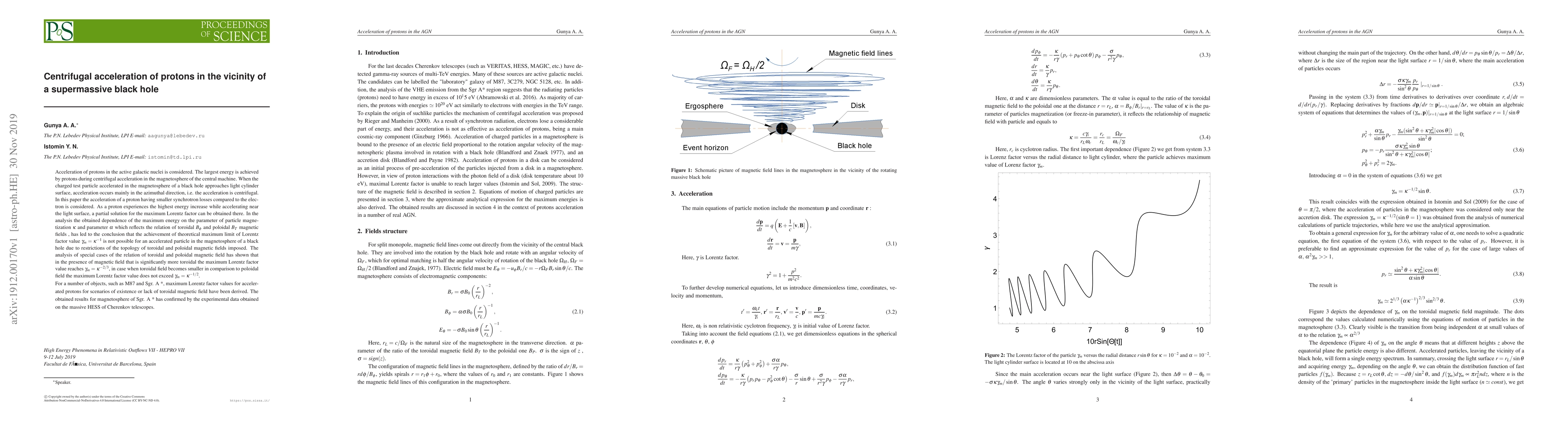 Acceleration of protons in the active galactic nuclei is considered. The largest energy is achieved by protons during centrifugal acceleration in the magnetosphere of the central machine. When the proton accelerated in the magnetosphere of a black hole approaches light cylinder surface, acceleration occurs mainly in the azimuthal direction, i.e. the acceleration is centrifugal. In this paper the acceleration of a proton having smaller synchrotron losses compared to the electron is considered. As a proton experiences the highest energy increase while accelerating near the light surface, a partial solution for the maximum Lorentz factor can be obtained there. In the analysis the obtained dependence of the maximum energy on the parameter of particle magnetization $ \kappa $ and parameter $ \alpha $ which reflects the relation of toroidal $ B_\phi $ and poloidal $ B_T $ magnetic fields , has led to the conclusion that the achievement of theoretical maximum limit of Lorentz factor value $ \gamma_m=\kappa^{-1}$ is not possible for an accelerated particle in the magnetosphere of a black hole due to restrictions of the topology of toroidal and poloidal magnetic fields imposed. The analysis of special cases of the relation of toroidal and poloidal magnetic field has shown that in the presence of magnetic field that is significantly more toroidal the maximum Lorentz factor value reaches $\gamma_m = \kappa^ {-2/3} $, in case when toroidal field becomes smaller in comparison to poloidal field the maximum Lorentz factor value does not exceed $\gamma_m = \kappa^ {-1/2} $. For a number of objects, such as M87 and Sgr. A *, maximum Lorentz factor values for accelerated protons for scenarios of existence or lack of toroidal magnetic field have been derived. The obtained results for magnetosphere of Sgr. A * has confirmed by the experimental data obtained on the massive HESS of Cherenkov telescopes.