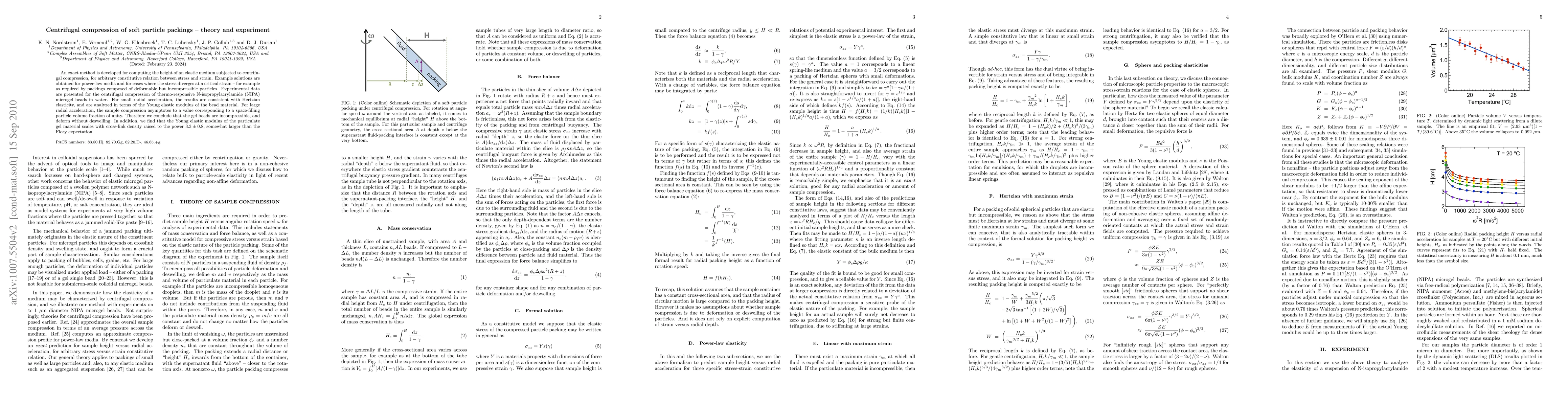 An exact method is developed for computing the height of an elastic medium subjected to centrifugal compression, for arbitrary constitutive relation between stress and strain. Example solutions are obtained for power-law media and for cases where the stress diverges at a critical strain -- for example as required by packings composed of deformable but incompressible particles. Experimental data are presented for the centrifugal compression of thermo-responsive N-isopropylacrylamide (NIPA) microgel beads in water. For small radial acceleration, the results are consistent with Hertzian elasticity, and are analyzed in terms of the Young elastic modulus of the bead material. For large radial acceleration, the sample compression asymptotes to a value corresponding to a space-filling particle volume fraction of unity. Therefore we conclude that the gel beads are incompressible, and deform without deswelling. In addition, we find that the Young elastic modulus of the particulate gel material scales with cross-link density raised to the power 3.3+-0.8, somewhat larger than the Flory expectation.