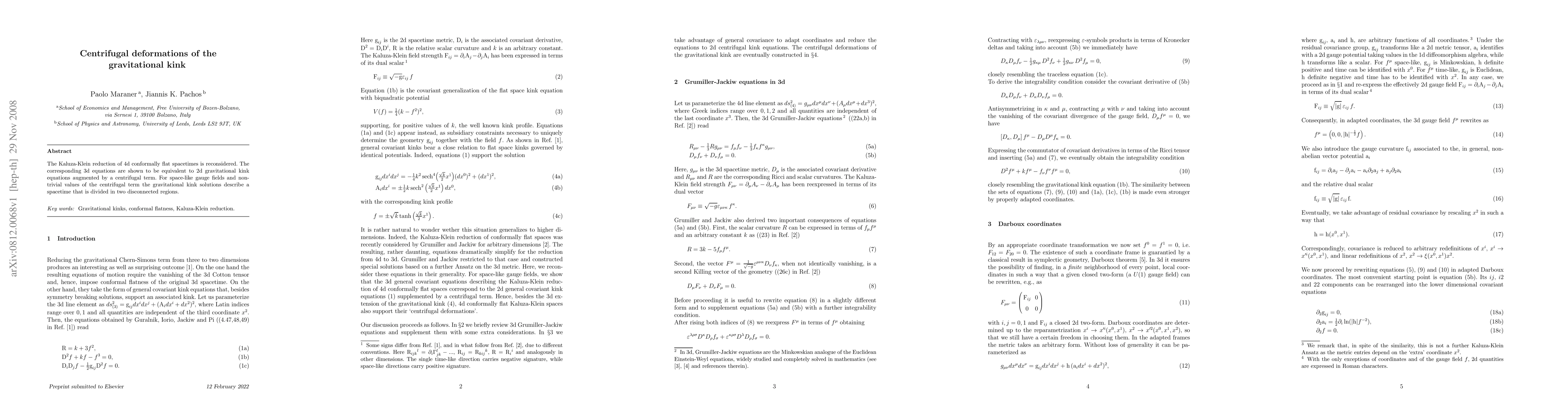 The Kaluza-Klein reduction of 4d conformally flat spacetimes is reconsidered. The corresponding 3d equations are shown to be equivalent to 2d gravitational kink equations augmented by a centrifugal term. For space-like gauge fields and non-trivial values of the centrifugal term the gravitational kink solutions describe a spacetime that is divided in two disconnected regions.