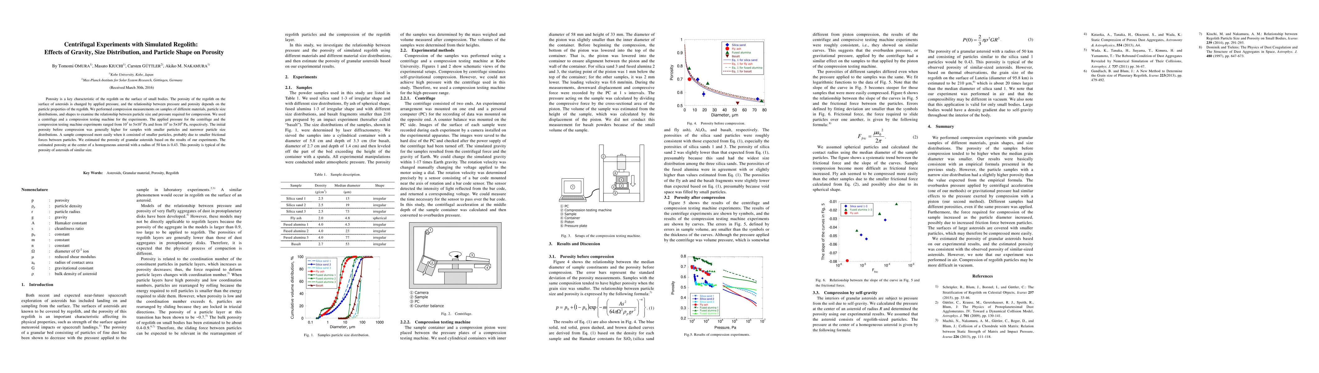 This study investigates how gravity, particle size distribution, and particle shape affect the porosity of simulated regolith using centrifugal and compression experiments. The results suggest that smaller particles and narrower size distributions lead to higher initial porosity and easier compression, estimating a central porosity of 0.43 for a 50 km radius asteroid.