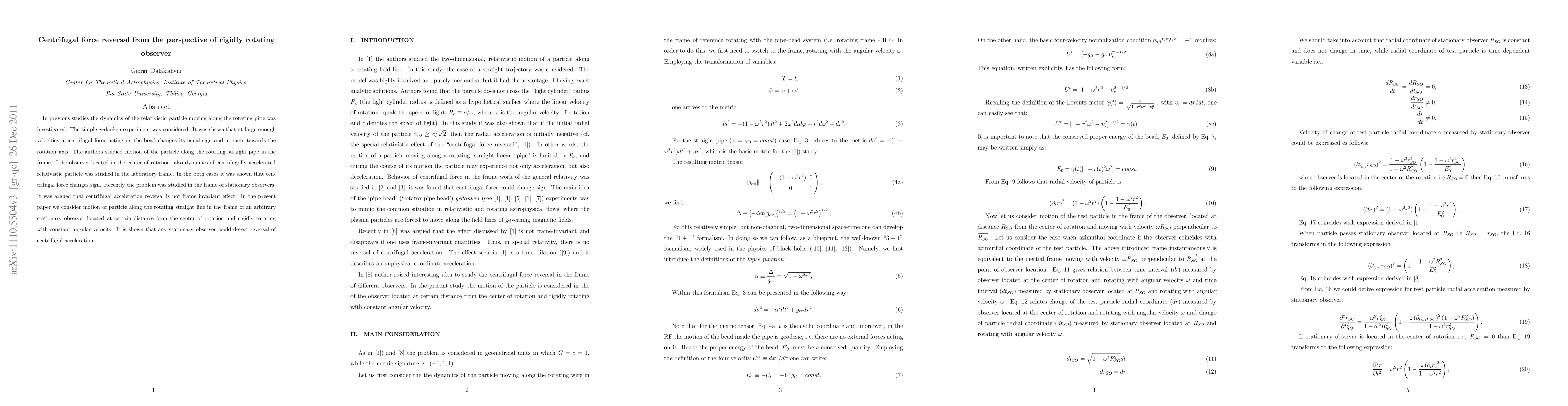 This paper investigates the dynamics of a relativistic particle moving along a rotating pipe from the perspective of a rigidly rotating observer. It demonstrates that regardless of the observer's distance from the rotation axis, centrifugal force reversal can be detected, contradicting the notion that this effect is not frame invariant.