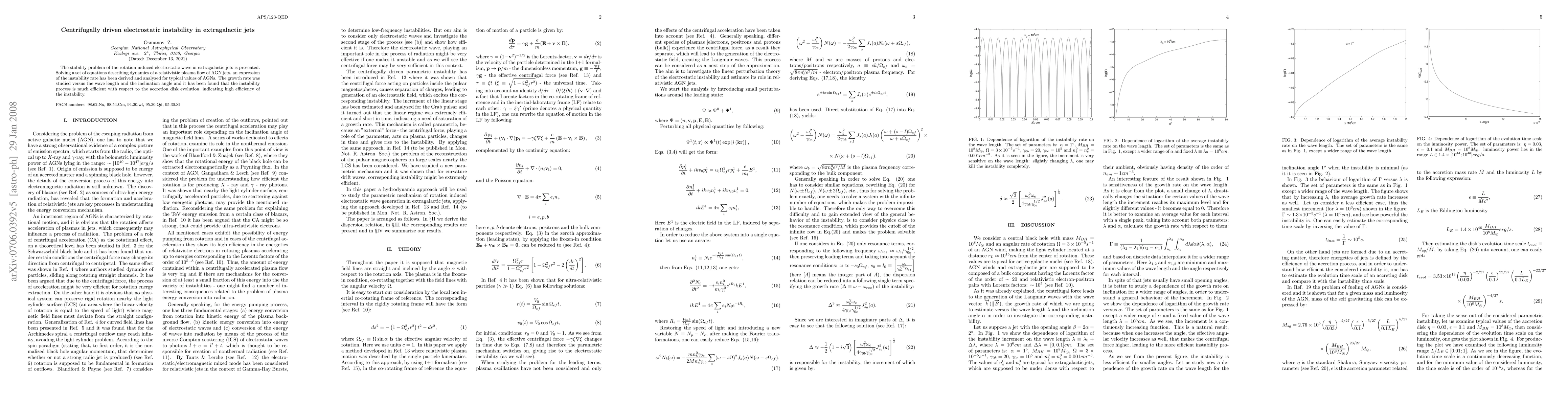 The stability problem of the rotation induced electrostatic wave in extragalactic jets is presented. Solving a set of equations describing dynamics of a relativistic plasma flow of AGN jets, an expression of the instability rate has been derived and analyzed for typical values of AGNs. The growth rate was studied versus the wave length and the inclination angle and it has been found that the instability process is much efficient with respect to the accretion disk evolution, indicating high efficiency of the instability.