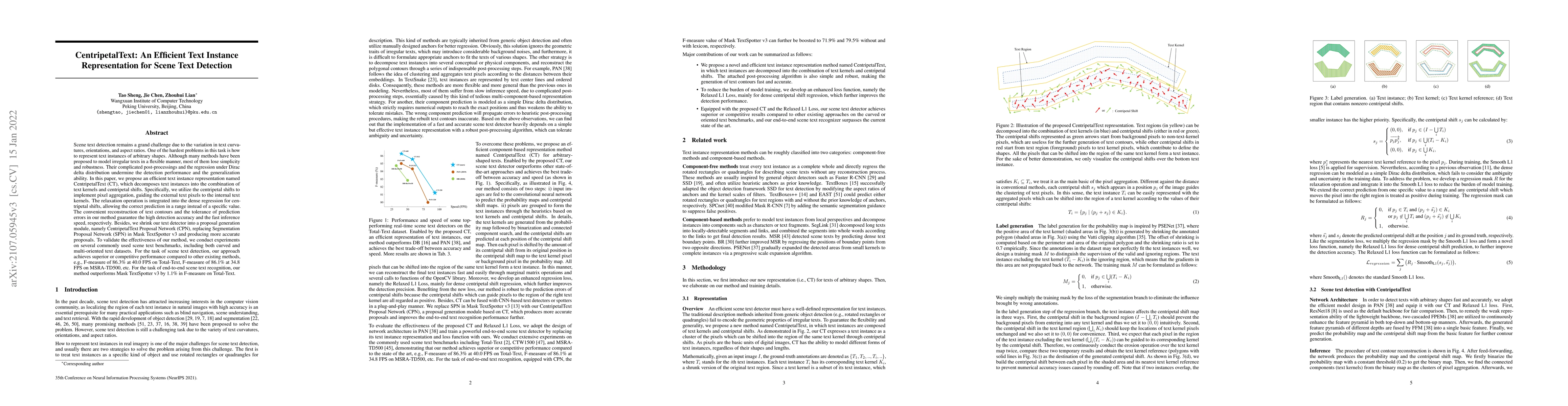 The paper proposes CentripetalText, an efficient text instance representation for scene text detection that decomposes text instances into text kernels and centripetal shifts, achieving high detection accuracy and fast inference speed. The method outperforms existing techniques, achieving an F-measure of 86.3% at 40 FPS on Total-Text and 86.1% at 34.8 FPS on MSRA-TD500.