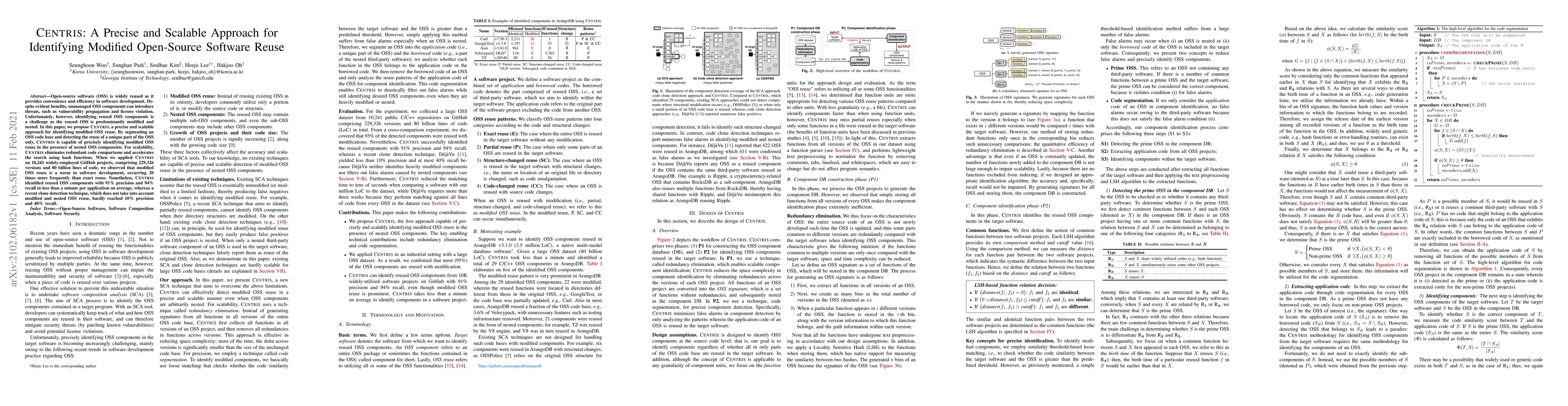 CENTRIS proposes a precise and scalable approach for identifying modified open-source software reuse by segmenting an OSS code base and detecting the reuse of a unique part of the OSS, while eliminating redundant code comparisons using hash functions.