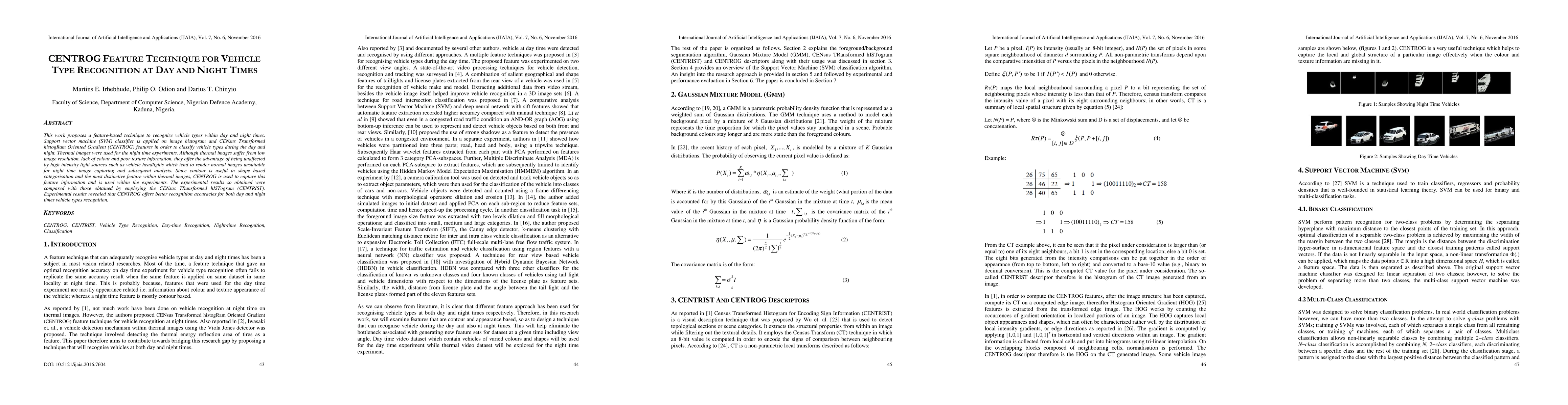 This paper proposes a feature-based technique using CENTROG and SVM for vehicle type recognition under day and night conditions. CENTROG, which captures contour information, outperforms CENTRIST in both day and night scenarios, especially in thermal images where headlights pose challenges.