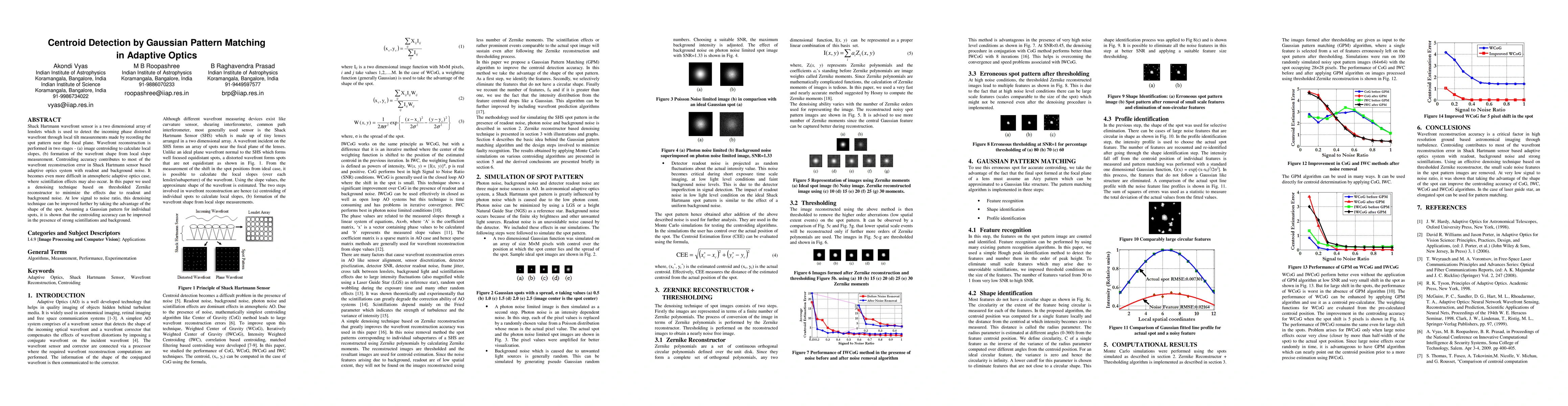 This paper proposes a centroid detection method using Gaussian pattern matching to enhance the accuracy of Shack Hartmann wavefront sensors in adaptive optics systems, particularly under atmospheric conditions with noise and scintillation effects. The method employs a denoising technique based on thresholded Zernike reconstructor to improve centroiding accuracy at low signal-to-noise ratios.