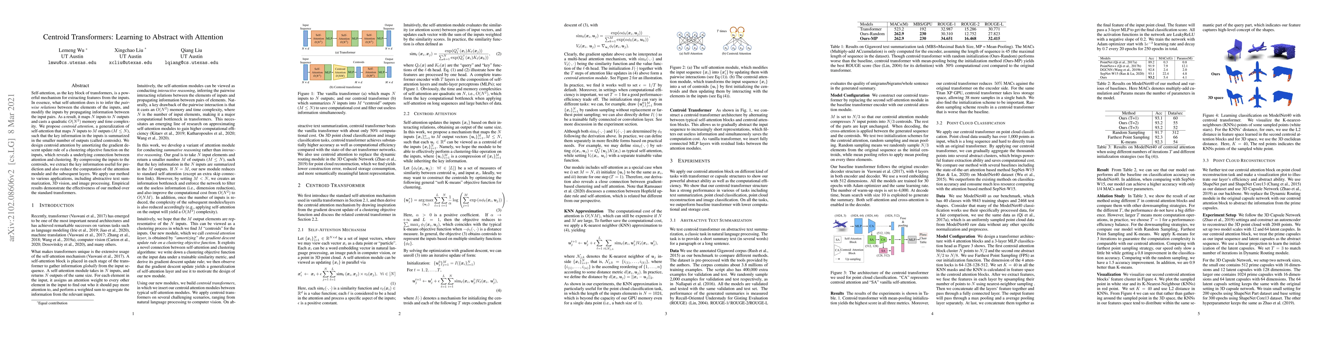 Self-attention, as the key block of transformers, is a powerful mechanism for extracting features from the inputs. In essence, what self-attention does is to infer the pairwise relations between the elements of the inputs, and modify the inputs by propagating information between input pairs. As a result, it maps inputs to N outputs and casts a quadratic $O(N^2)$ memory and time complexity. We propose centroid attention, a generalization of self-attention that maps N inputs to M outputs $(M\leq N)$, such that the key information in the inputs are summarized in the smaller number of outputs (called centroids). We design centroid attention by amortizing the gradient descent update rule of a clustering objective function on the inputs, which reveals an underlying connection between attention and clustering. By compressing the inputs to the centroids, we extract the key information useful for prediction and also reduce the computation of the attention module and the subsequent layers. We apply our method to various applications, including abstractive text summarization, 3D vision, and image processing. Empirical results demonstrate the effectiveness of our method over the standard transformers.