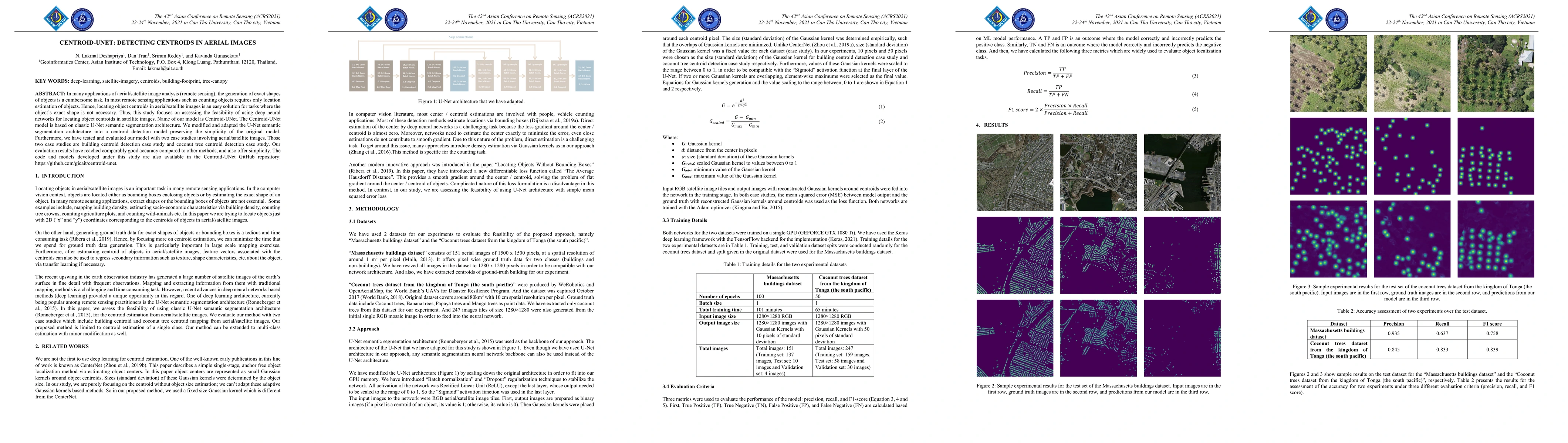 The Centroid-UNet model adapts the U-Net architecture for detecting object centroids in aerial/satellite images, offering a simpler alternative to generating exact object shapes. Evaluations on building and coconut tree detection cases show comparable accuracy and simplicity.