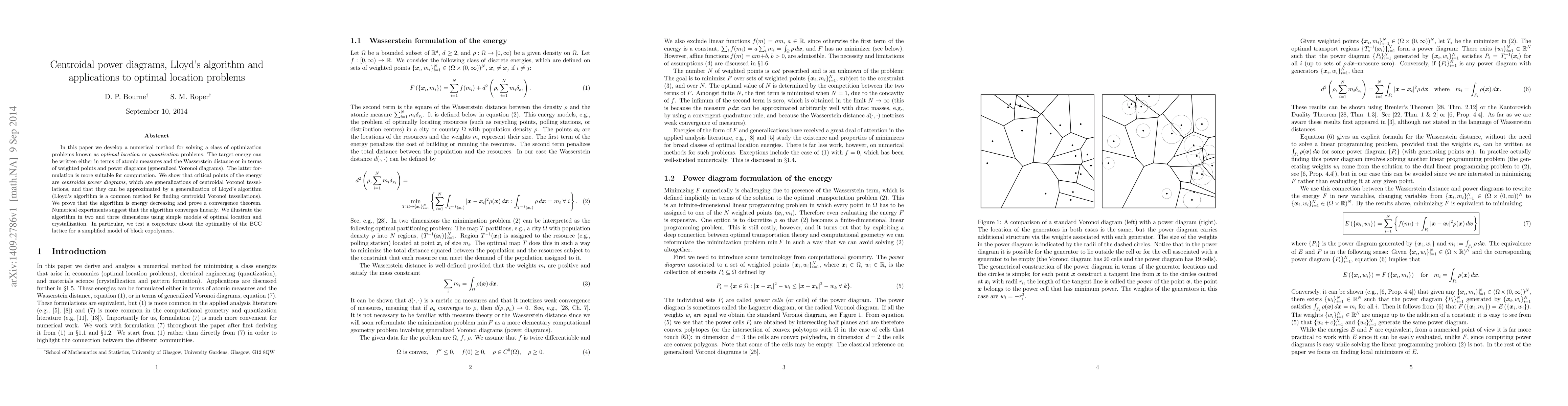This paper develops a numerical method for optimal location problems using centroidal power diagrams and a generalized Lloyd's algorithm. The method converges linearly and is tested in two and three dimensions, including a model for block copolymers.