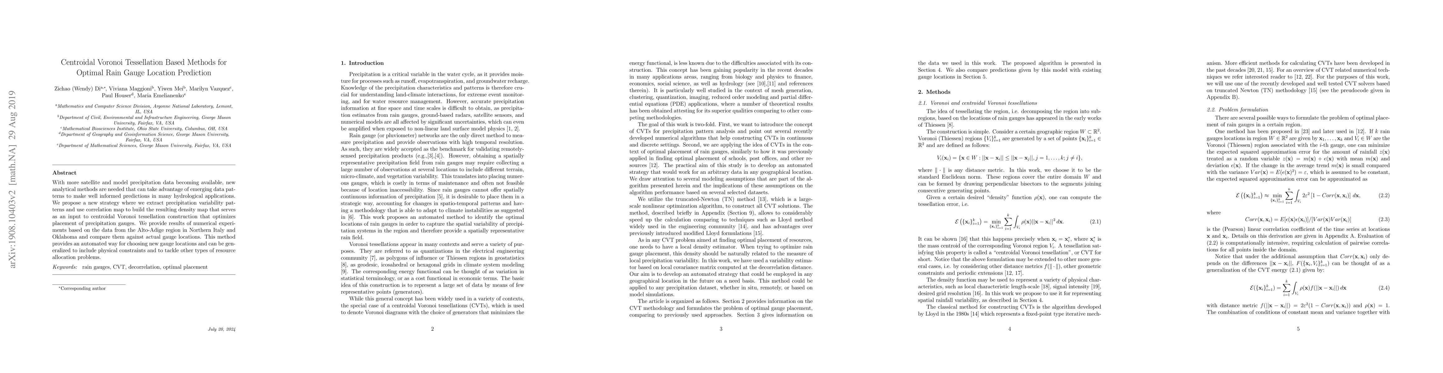 This paper proposes a centroidal Voronoi tessellation method to optimize the placement of rain gauges based on precipitation variability patterns and correlation maps. Experiments in Alto-Adige and Oklahoma demonstrate its effectiveness in predicting optimal gauge locations compared to actual data.