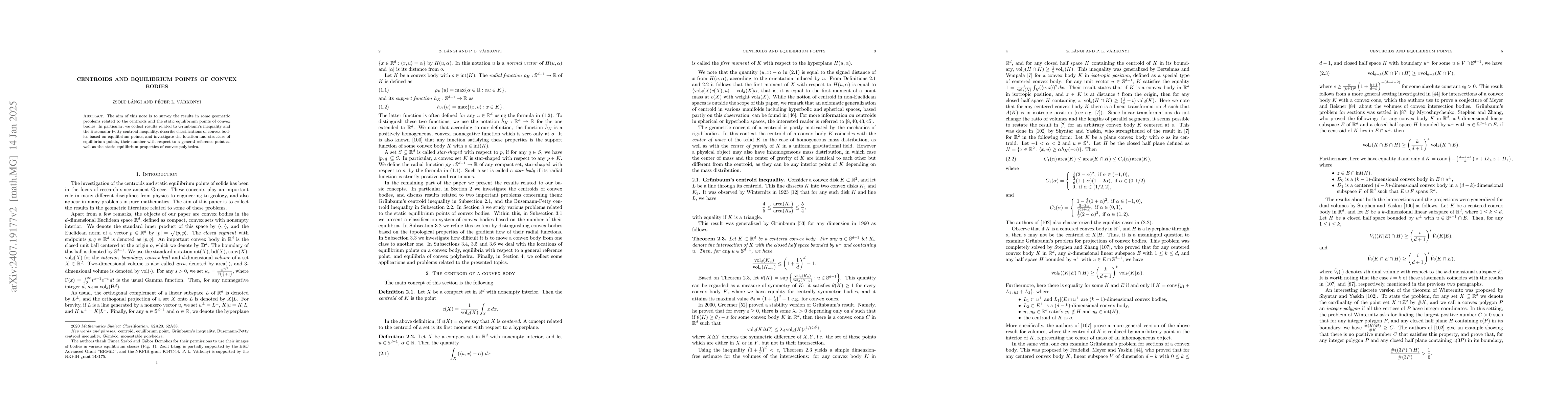 This paper surveys geometric results on centroids and equilibrium points of convex bodies, focusing on Gr\"unbaum's and Busemann-Petty centroid inequalities, classifications of convex bodies by equilibrium points, and the static equilibrium properties of convex polyhedra. It investigates the location, structure, and number of equilibrium points.