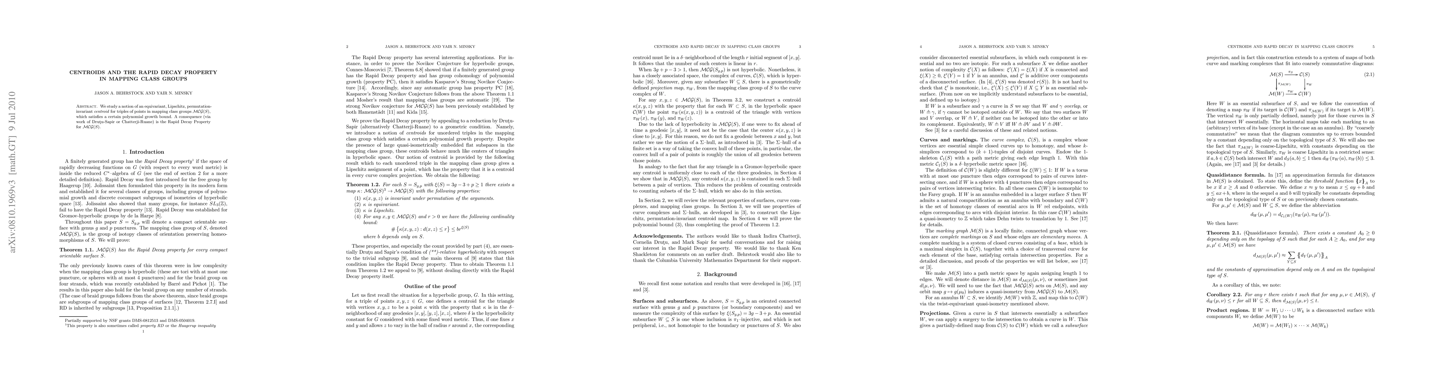 This paper introduces a Lipschitz, permutation-invariant centroid for triples of points in mapping class groups, demonstrating polynomial growth. This leads to the Rapid Decay Property for these groups, building on prior work by Drutu-Sapir and Chatterji-Ruane.