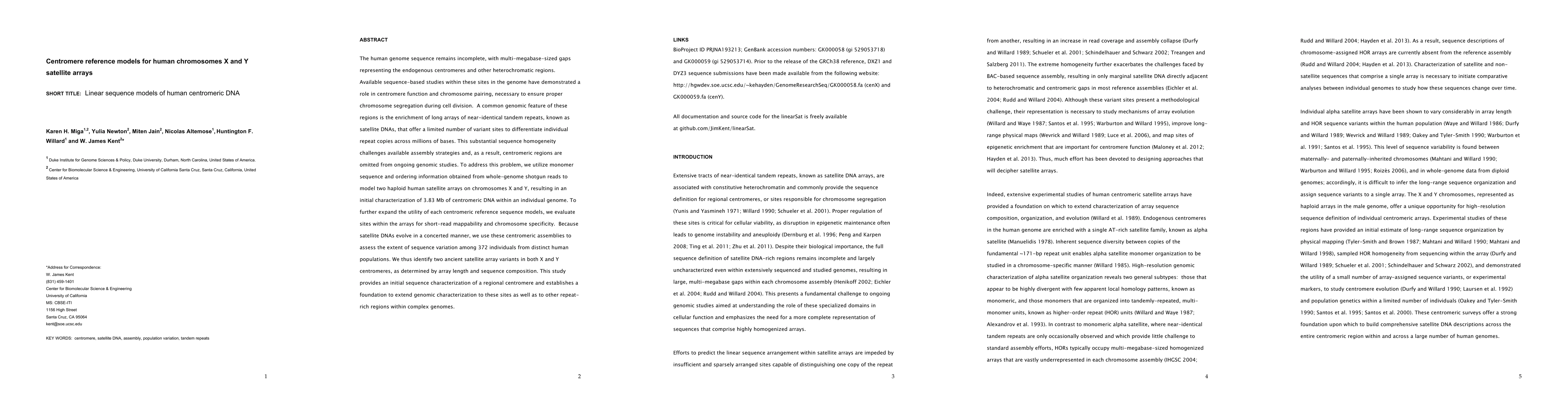 This study presents a locally ordered assembly of centromeric satellite DNA arrays on human chromosomes X and Y, creating a 3.83 Mb linear reference model. It evaluates sequence variation among 372 individuals, identifying two ancient satellite variants, and establishes a foundation for further genomic characterization of repeat-rich regions.